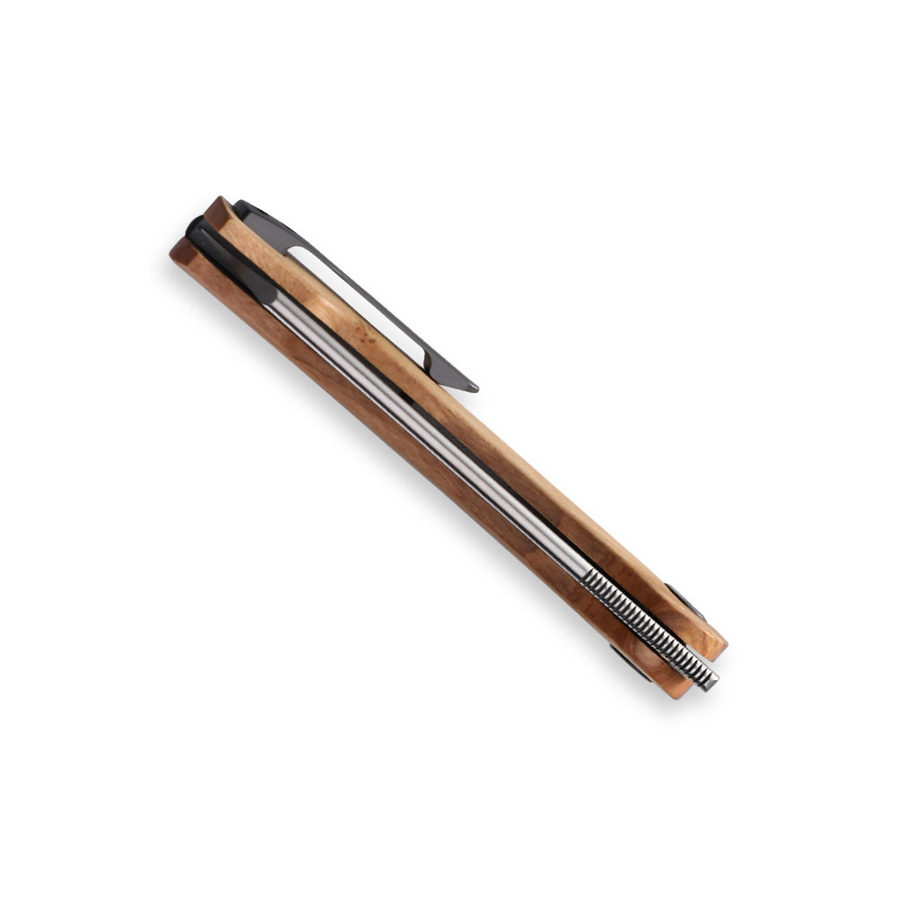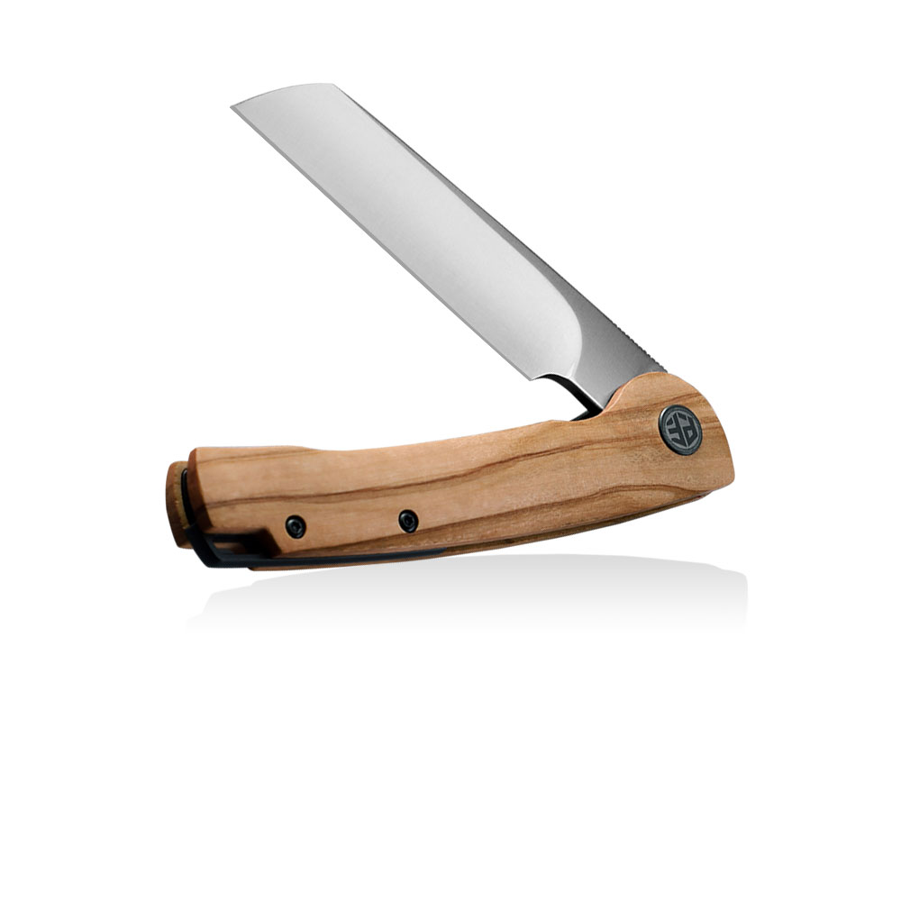 Okładziny rękojeści wykonane zostały z drewna oliwnego o dużej gęstości. Drewno tego typu jest bardzo wytrzymałe oraz twarde niemal tak jak stalowe ostrze (59-61 HRC). W dodatku jest materiałem bardzo eleganckim i o różnorodnych wzorach (na drewnie widać strukturę słojów). Rękojeść o ergonomicznym kształcie bardzo dobrze dopasowuje się do ręki i zapewnia stabilny i mocny chwyt. Okładki zostały wzmocnione backspacerem z tytanu.