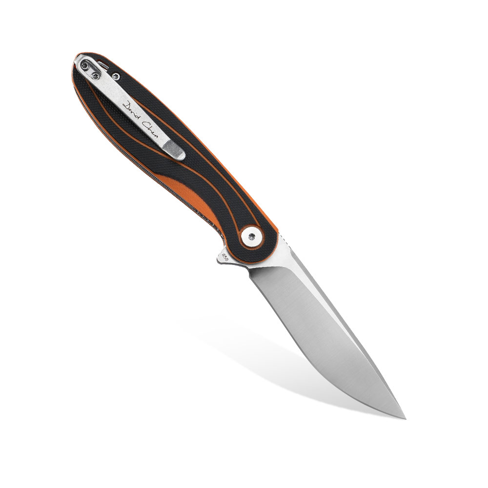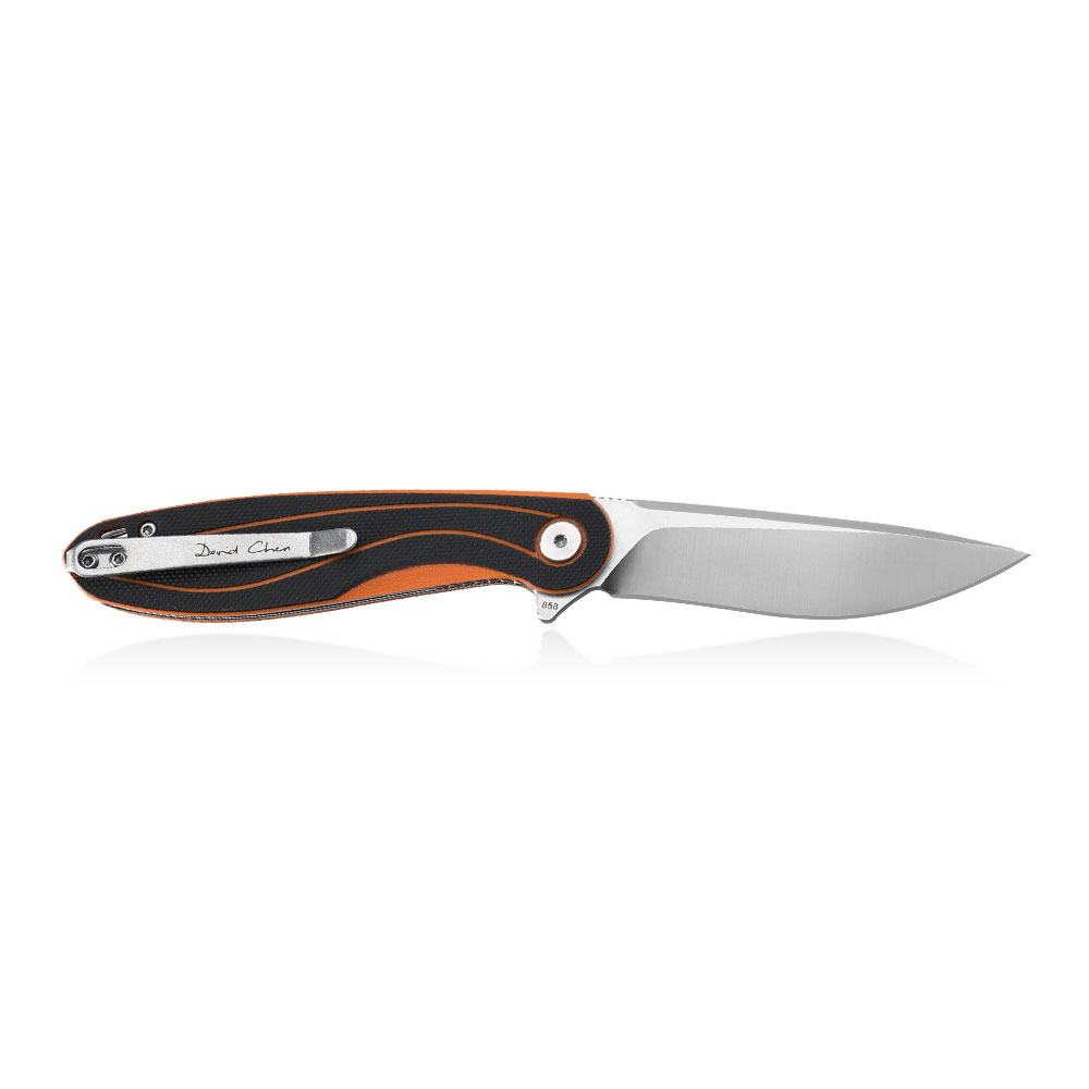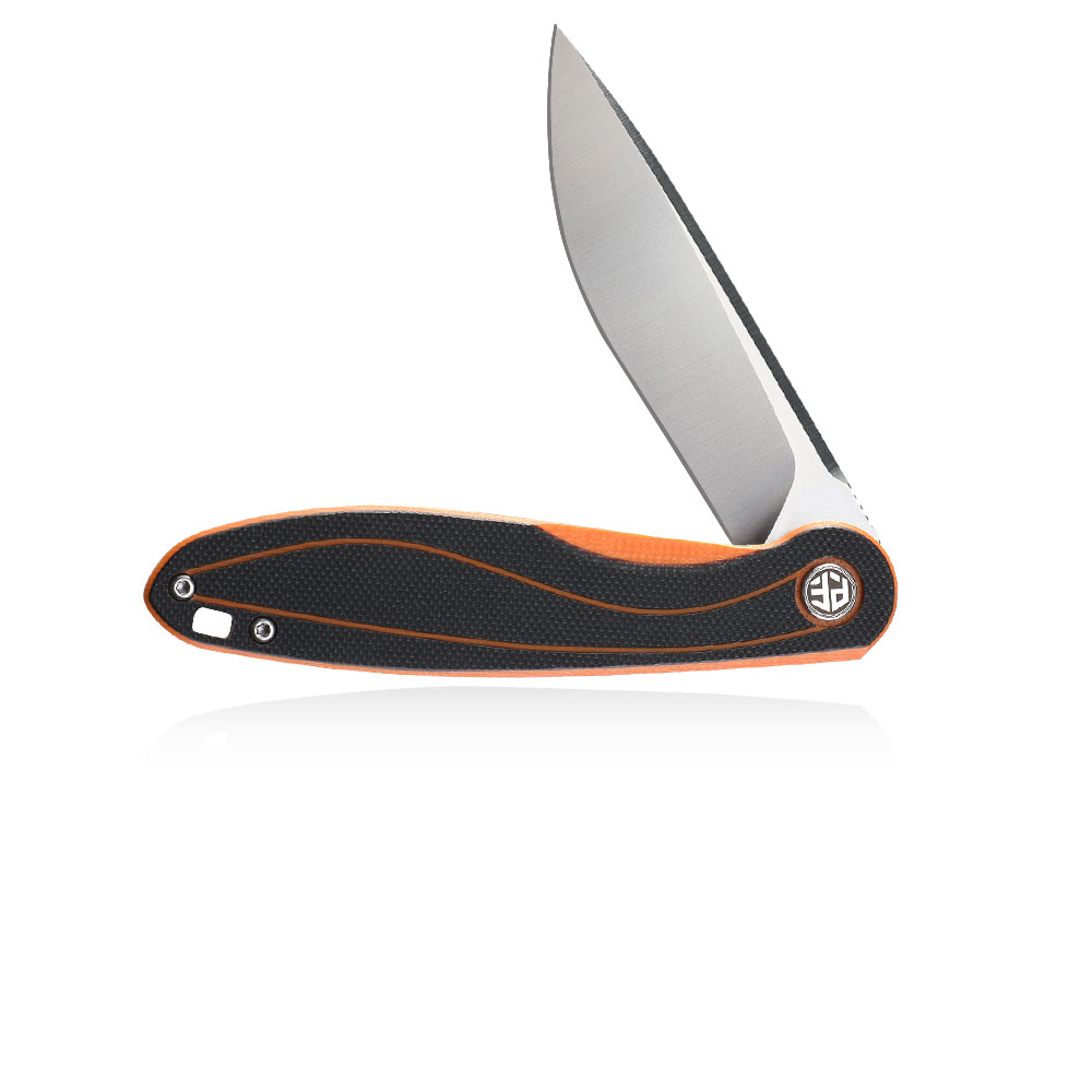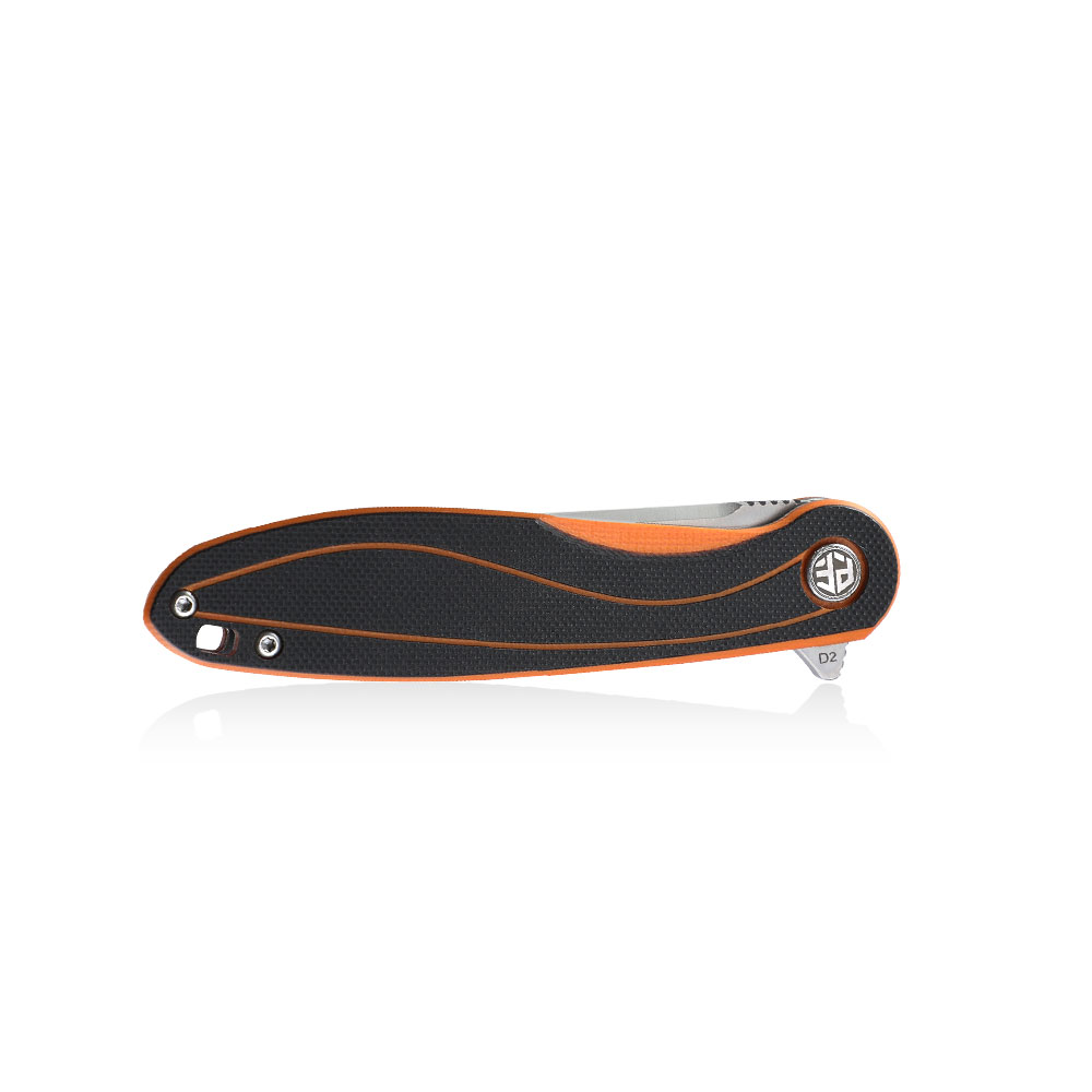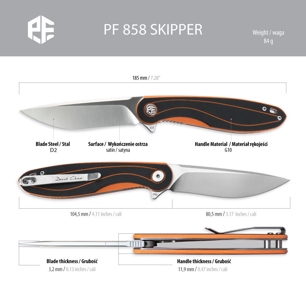 Nóż składany Petrified Fish Skipper PF-858 O Orange posiada wydajne ostrze typu drop point ze znanej z efektywności cięcia i nieuciążliwej w ostrzeniu i pielęgnacji stali D2. Rękojeść noża wykonana została z kompozytu G10 (połączenie czarnego i pomarańczowego koloru). Otwieranie noża następuję za sprawą wystającej płetwy (flipper) a ostrze blokuje blokada typu liner lock.