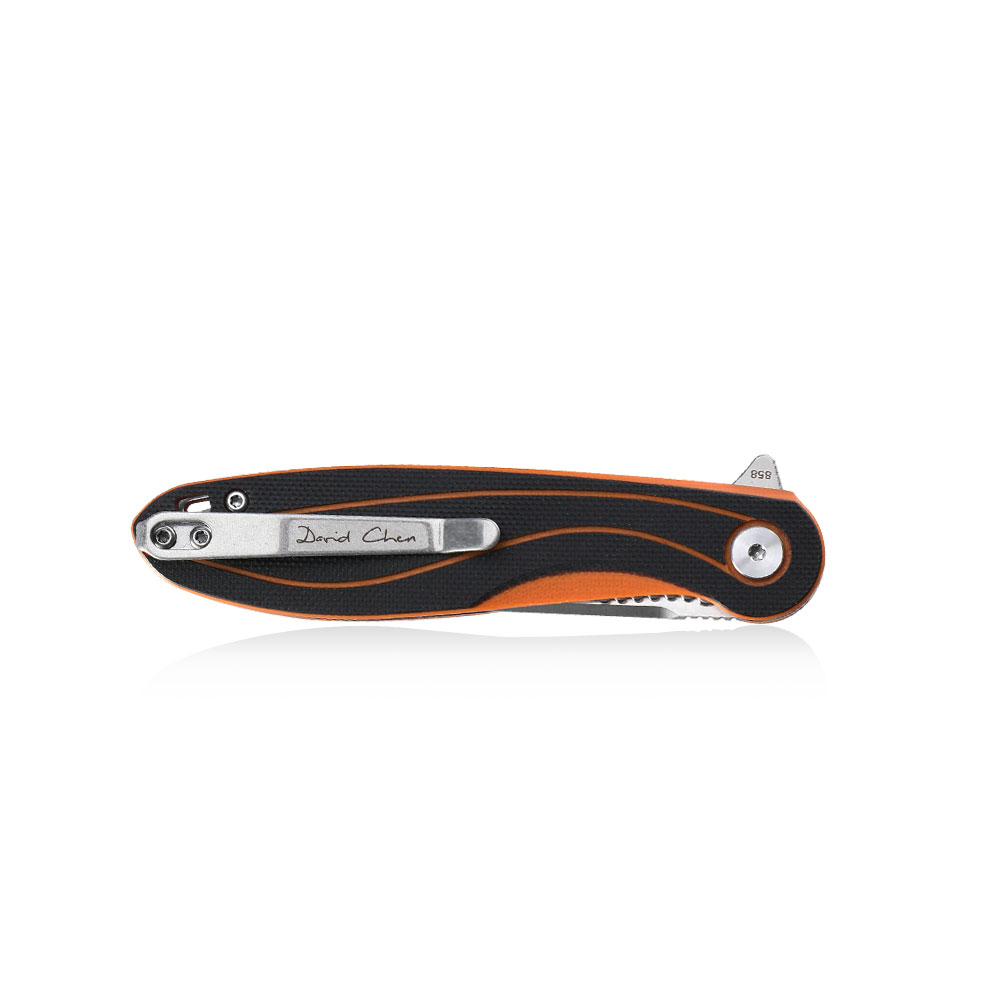Stalowy klips ze stali nierdzewnej zapewnia stabilne przenoszenie noża w kieszeni, zamocowanie w plecaku, sakwie, nerce itd., czym przyczynia się do minimalizacji ryzyka zgubienia narzędzia. Jest to klips deep carry umożliwiający dyskretne przenoszenie noża w kieszeni. Klips zaprojektowany w stylu pasującym do całości projektu ozdobiony został podpisem designer’a. W rękojeści zaprojektowano otwór na paracord, linkę itp. rozwiązania zapobiegające przed zgubieniem lub upuszczeniem zabezpieczonego nimi narzędzia. Do otworu można również doczepić ozdobny koralik itd. (koralik nie znajduje się w zestawie).