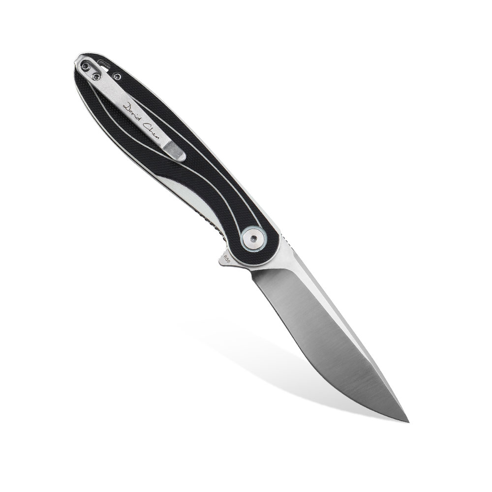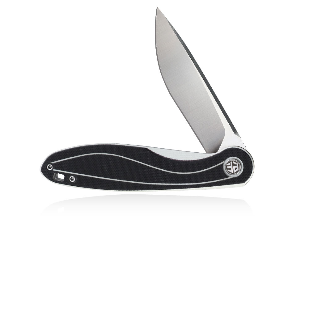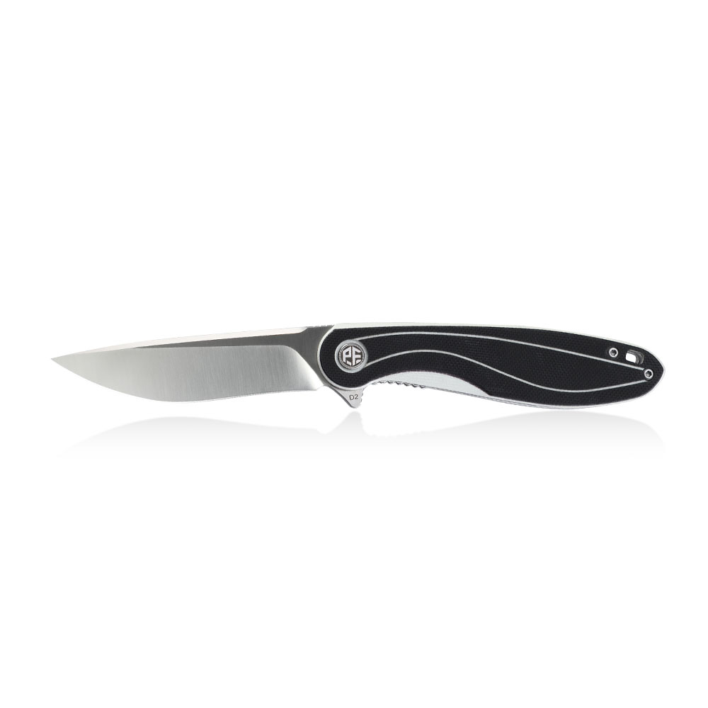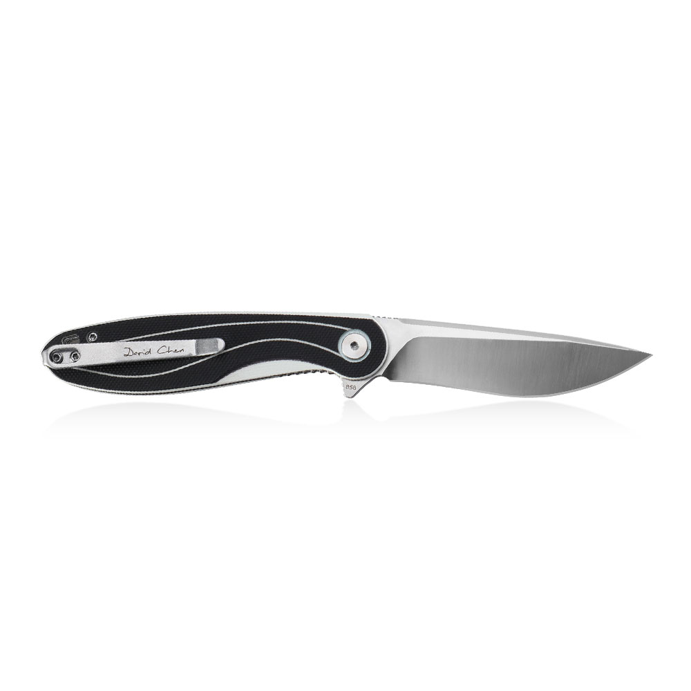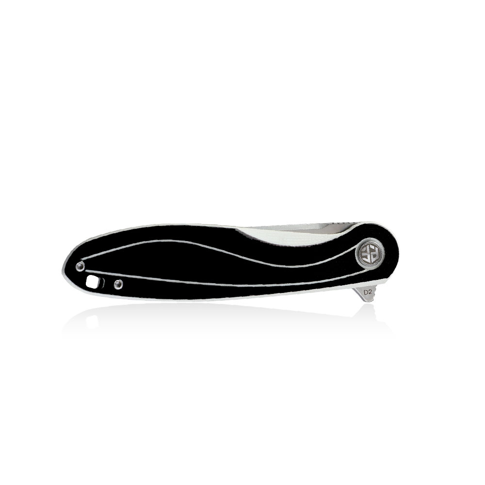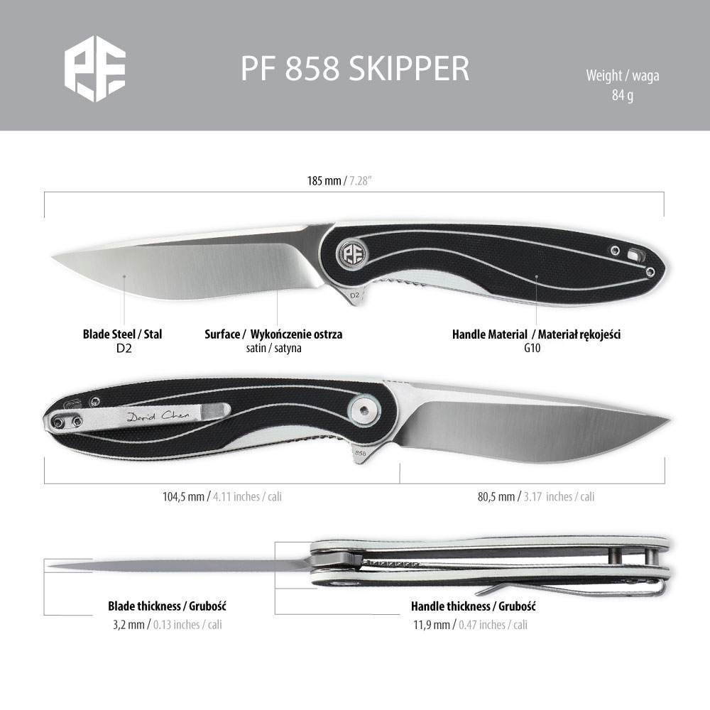 Nóż składany Petrified Fish Skipper PF-858 W White posiada wydajne ostrze typu drop point ze znanej z efektywności cięcia i nieuciążliwej w ostrzeniu i pielęgnacji stali D2. Rękojeść noża wykonana została z kompozytu G10 (połączenie czarnego i białego koloru). Otwieranie noża następuję za sprawą wystającej płetwy (flipper) a ostrze blokuje blokada typu liner lock.