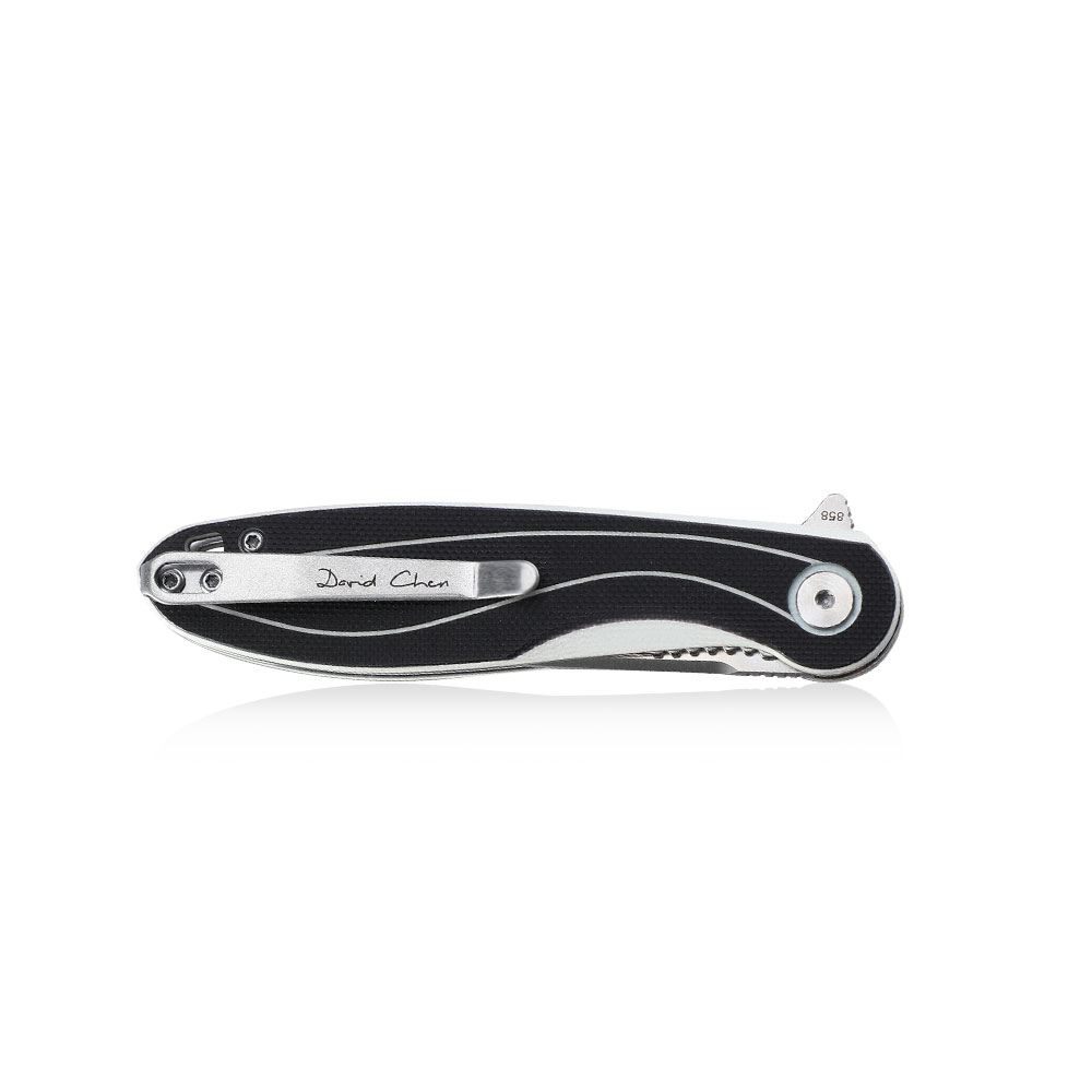 Stalowy klips ze stali nierdzewnej zapewnia stabilne przenoszenie noża w kieszeni, zamocowanie w plecaku, sakwie, nerce itd., czym przyczynia się do minimalizacji ryzyka zgubienia narzędzia. Jest to klips deep carry umożliwiający dyskretne przenoszenie noża w kieszeni. Klips zaprojektowany w stylu pasującym do całości projektu ozdobiony został podpisem designer’a. W rękojeści zaprojektowano otwór na paracord, linkę itp. rozwiązania zapobiegające przed zgubieniem lub upuszczeniem zabezpieczonego nimi narzędzia. Do otworu można również doczepić ozdobny koralik itd. (koralik nie znajduje się w zestawie).