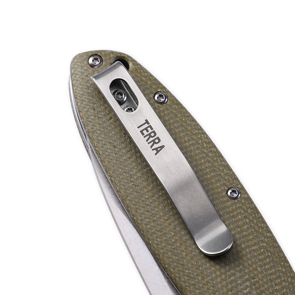 Nóż składany Petrified Fish Terra PF-B01 GRMW Green Micarta posiada wydajne ostrze typu drop point ze stali D2. Rękojeść noża wykonana została z zielonej micarty osadzonej na stalowych linersach. Designu noża dopełnia backspacer oraz stalowy klips mocujący. Otwieranie noża następuję za sprawą wystającej płetwy (flipper) a ostrze blokuje blokada typu liner lock.