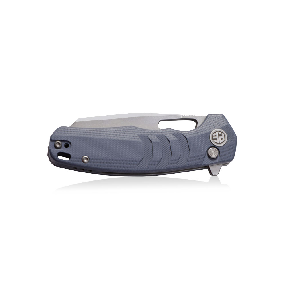 - Rękojeść: G10 o niebiesko-szarej tonacji, stalowe linersy, klips stalowy (Tip-Up, Deep Carry)