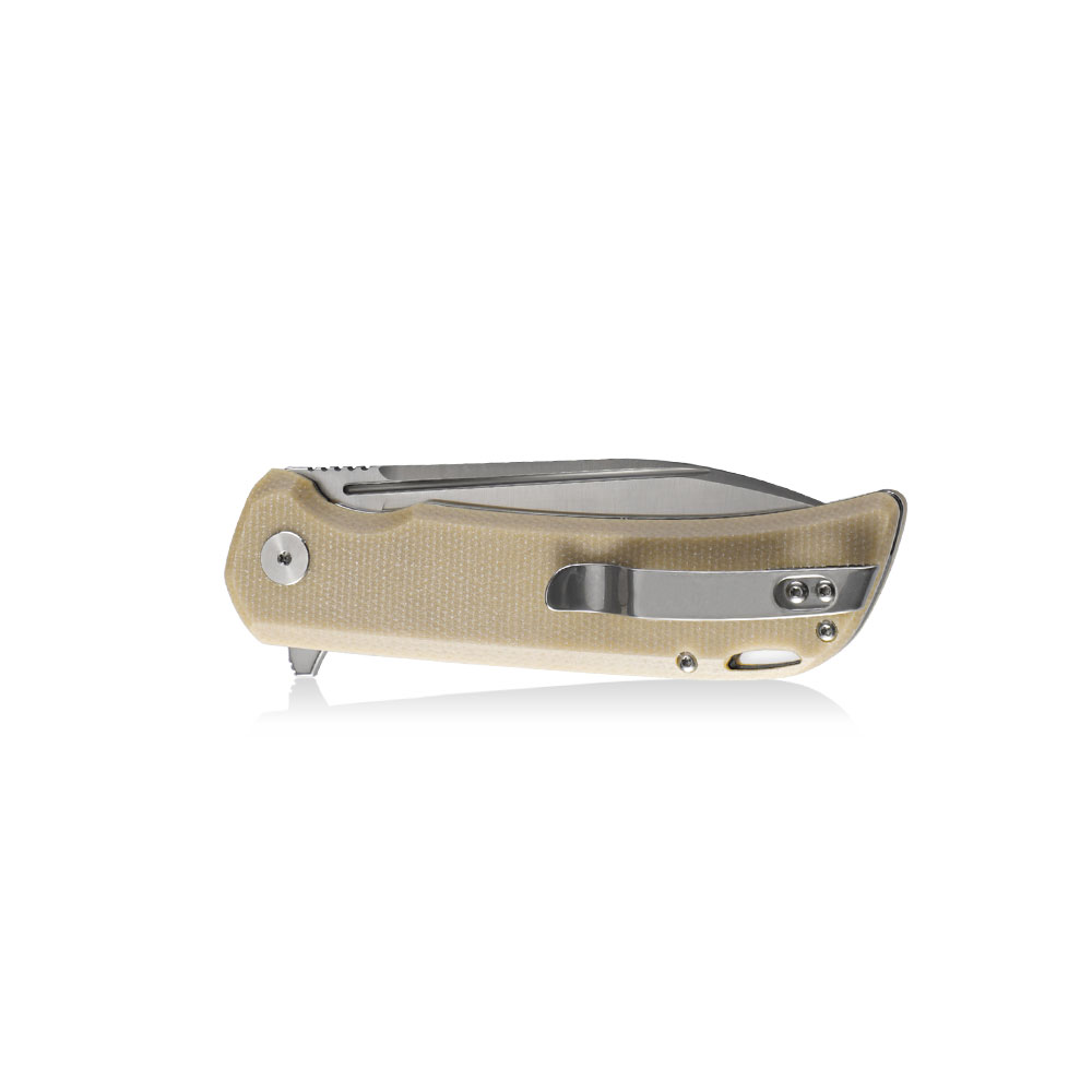 - Rękojeść: brązowa micarta (jasna wersja), stalowe linersy, klips stalowy (Tip-Up, Deep Carry)