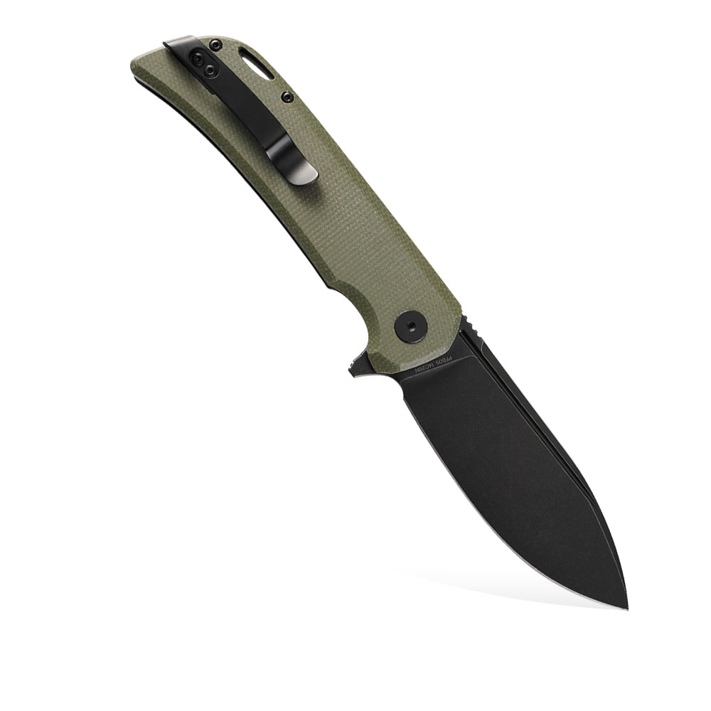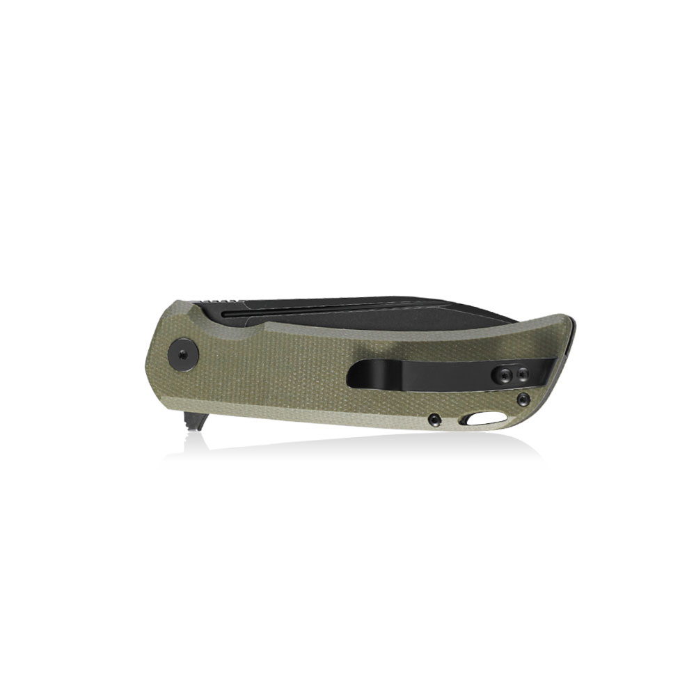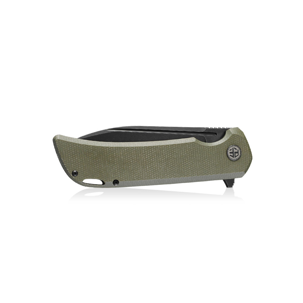 - Rękojeść: zielona micarta (green micarta), stalowe linersy, klips stalowy (Tip-Up, Deep Carry)