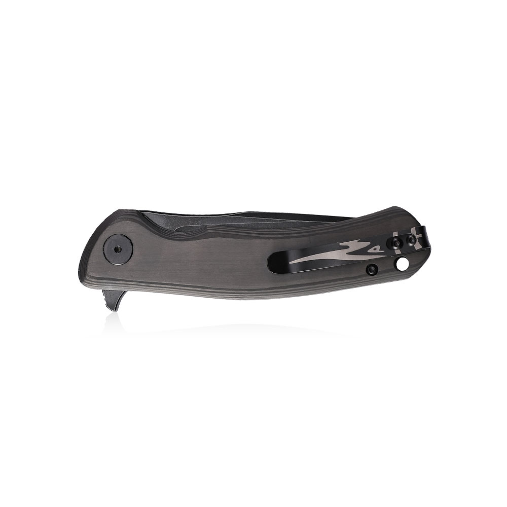 Tytanowy klips zapewnia stabilne przenoszenie noża w kieszeni, zamocowanie w plecaku, sakwie, nerce itd., czym przyczynia się do minimalizacji ryzyka zgubienia narzędzia. Klips zamontowany w stylu deep carry umożliwia schowanie przyczepionego noża głęboko w kieszeni. Odcień klipsa został dopasowany do materiału rekojeści. W rękojeści zaprojektowano otwór na paracord, linkę itp. rozwiązania zapobiegające przed zgubieniem lub upuszczeniem zabezpieczonego nimi narzędzia. Do otworu można również doczepić smycz lub identyfikator, które znajdują się w zestawie bądź swoje rozwiązanie (np. koralik itd.).