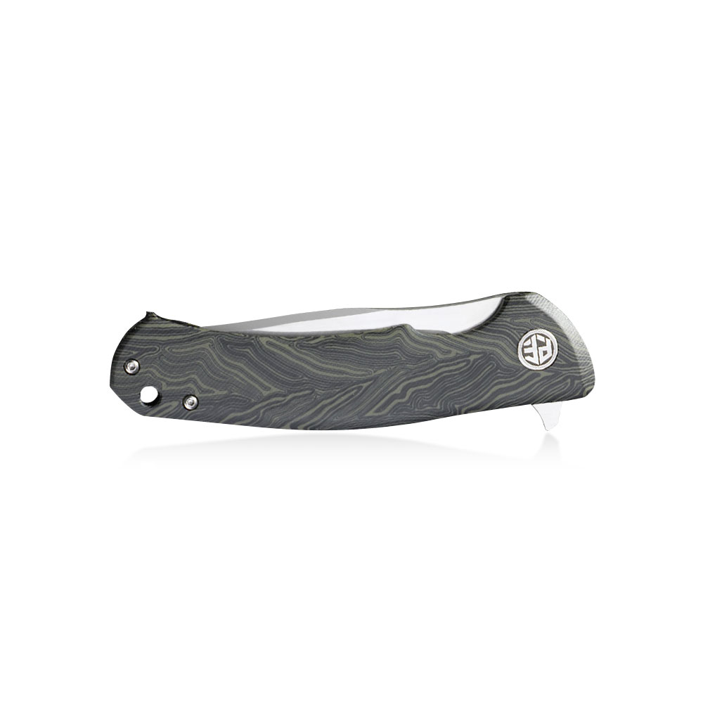 Okładziny rękojeści wykonane zostały z grubego, wytrzymałego kompozytu G10 układającego się we wzór stali damasceńskiej. Materiał okładek jest odporny na zawilgocenie, zmiany temperatury, większość rozpuszczalników i kwasów i co najważniejsze charakteryzuje się wysoką odpornością na uszkodzenia mechaniczne. Rękojeść o ergonomicznym kształcie bardzo dobrze dopasowuje się do ręki i zapewnia stabilny i mocny chwyt. Okładki zostały wzmocnione backspacerem z włókna węglowego (carbon fibre).
