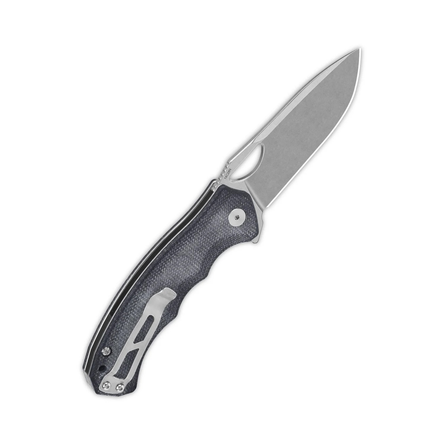 - Rękojeść: stalowe linersy, okładki z micarty (black micarta | czarna micarta), stalowy klips do przenoszenia (Tip-Up)