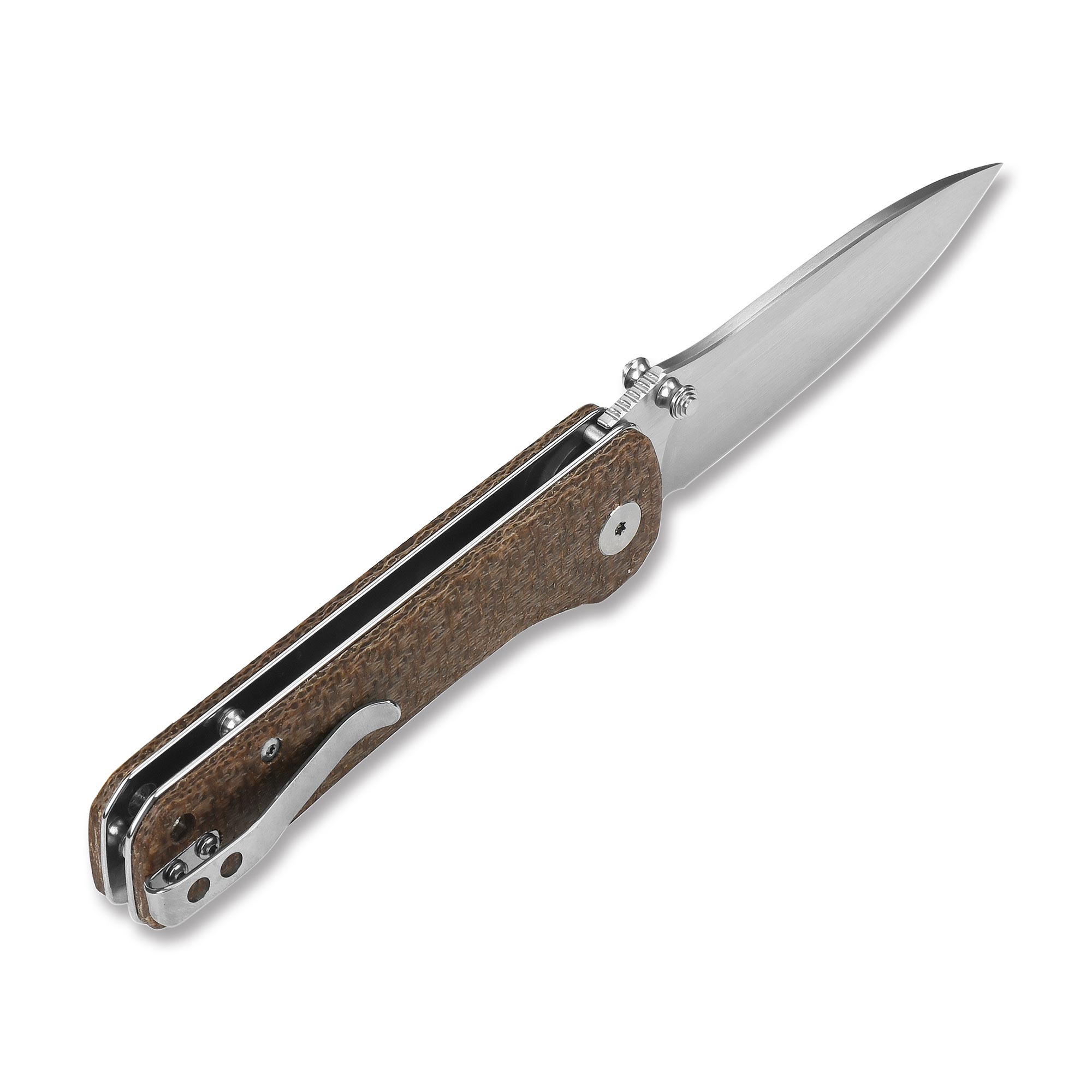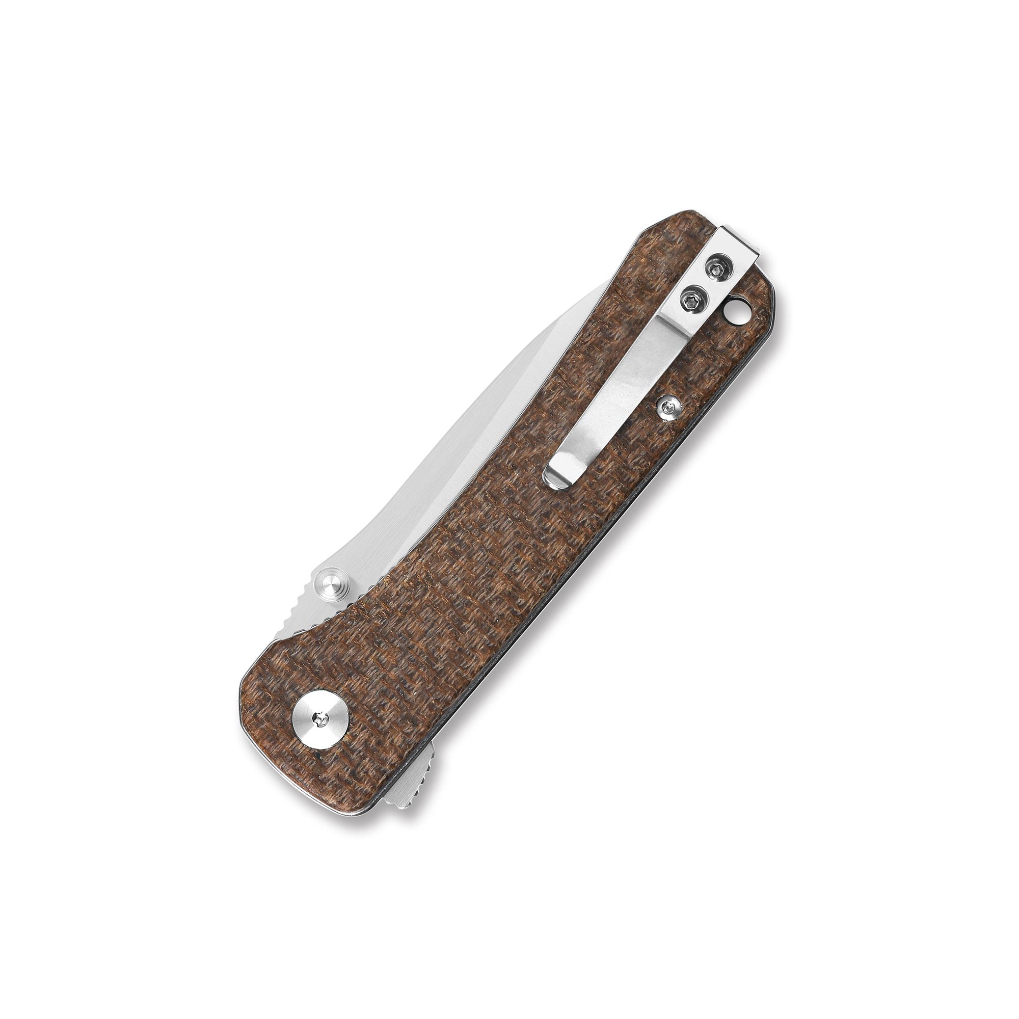Okładziny rękojeści z wytrzymałej brązowej lnianej micarty o ciekawej fakturze. Materiał okładek jest odporny na zawilgocenie, zmiany temperatury, większość rozpuszczalników i kwasów i charakteryzuje się wysoką odpornością na uszkodzenia mechaniczne. Okładziny posiadają obły kształt dla lepszego dopasowania i najlepiej układają się w mniejszej dłoni. W miejscu gdzie znajdziemy blokadę noża umiejscowiono delikatne wyprofilowanie na palec, aby zmniejszyć ryzyko zsunięcia się dłoni na ostrze i uniknąć niepożądanych skaleczeń.