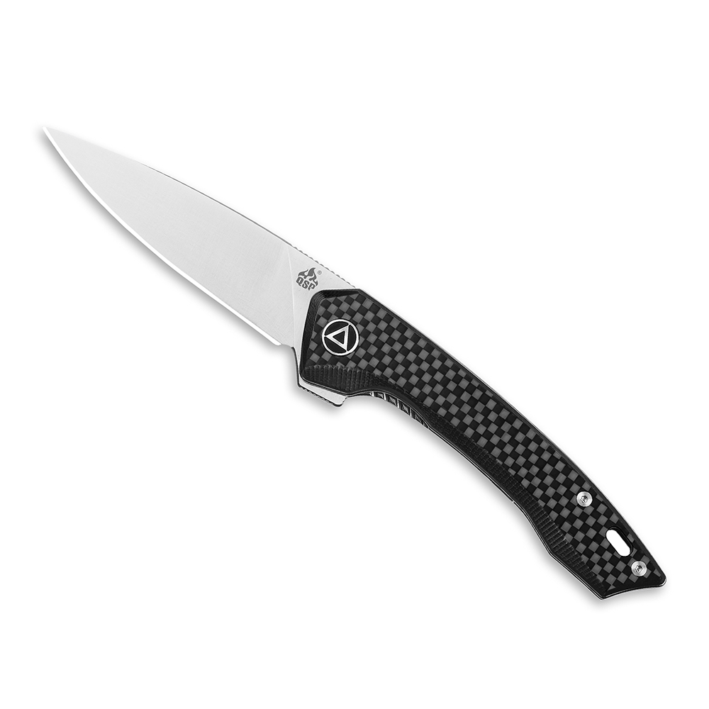 Atutem wykonania noża jest na pewno ostrze ze stali szwedzkiej Sandvik 14C28N, ale również ciekawy wzór kolorystyczny rączki (wzór plecionki, czy też szachownicy w wersji QS135-A) uzyskany poprzez położenie warstwy z włókna węglowego na kompozyt G10.
