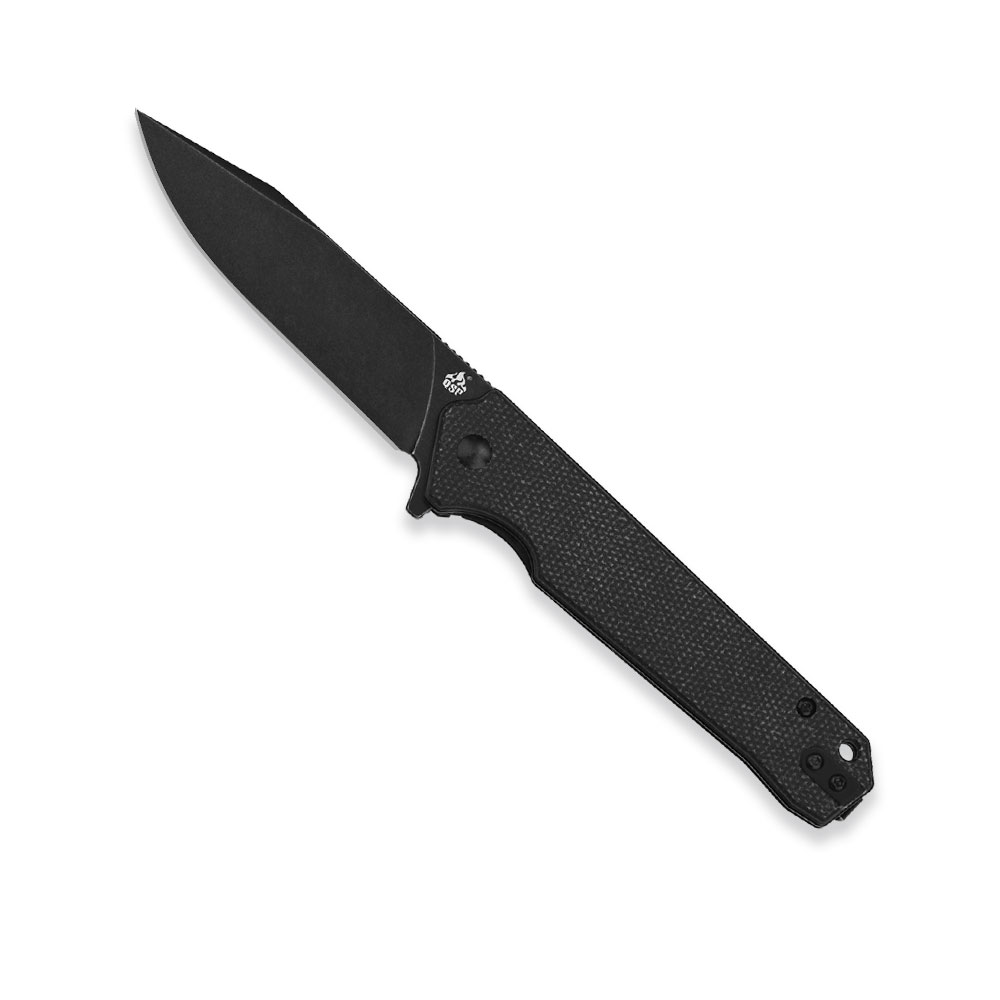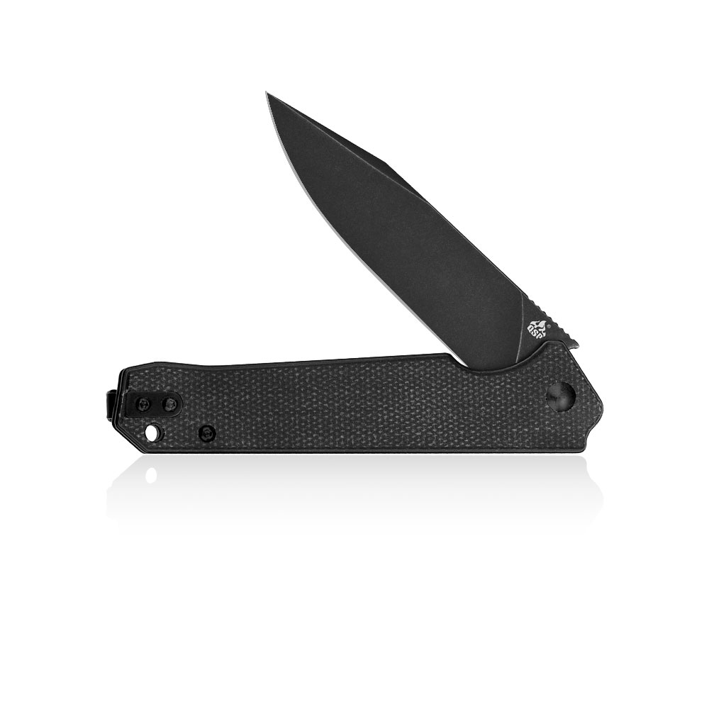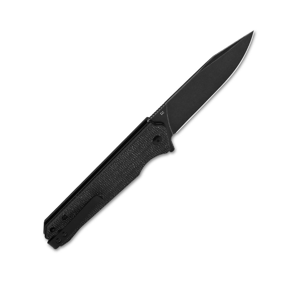 Nóż składany QSP Knife Mamba V2 QS111-G2 Black Stonewashed D2 Black Micarta posiada okładziny rękojeści wykonane z czarnej micarty. Czarne ostrze noża otwierane jest za sprawą wystającej z głowni płetwy (flipper), a przed złożeniem w trakcie pracy zabezpiecza go blokada liner lock.