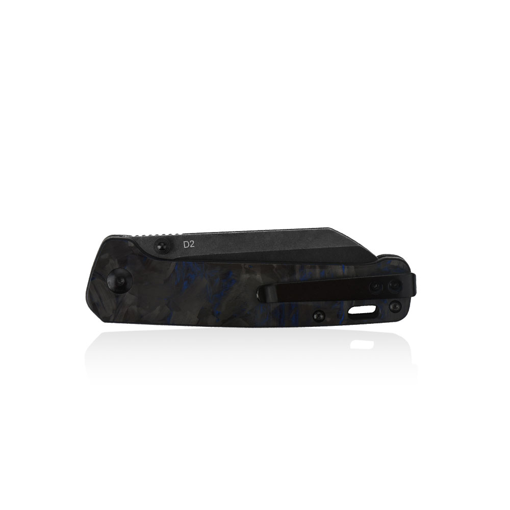 Okładziny rękojeści z wykonane zostały z połączenia wytrzymałego kompozytu G10 oraz włókna węglowego. Bazą okładek jest kompozyt G10, materiał odporny na zawilgocenie, zmiany temperatury, większość rozpuszczalników i kwasów, charakteryzujący się wysoką odpornością na uszkodzenia mechaniczne. Na G10 nałożona została warstwa włókna węglowego (carbon fiber) z „przebijającym” dodatkiem kolorystycznym. W tym przypadku jest to kolor niebieski.