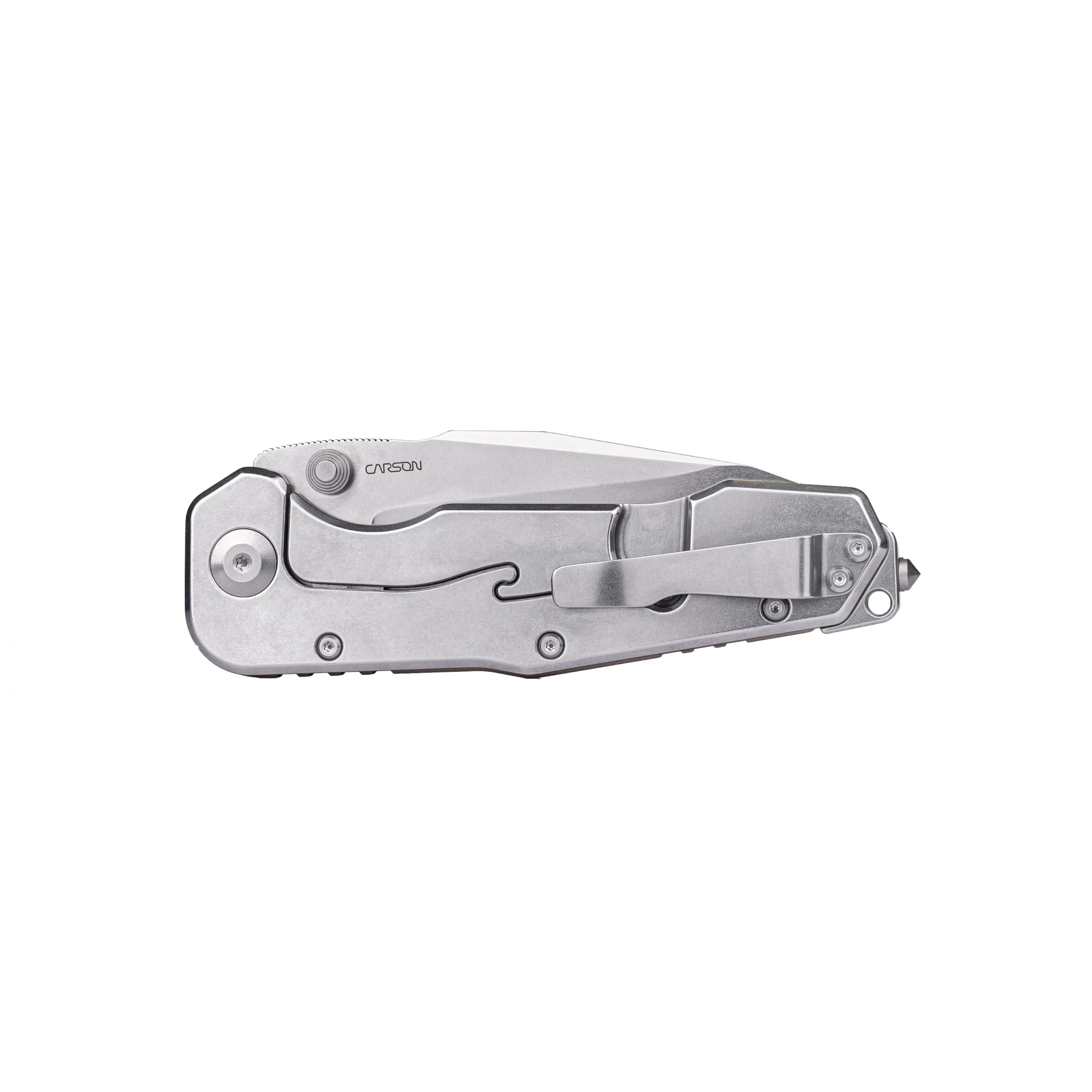 • Backspacer: stalowy z wybijakiem do szyb — zwiększa funkcjonalność noża i posiada otwór na linkę lub paracord.
