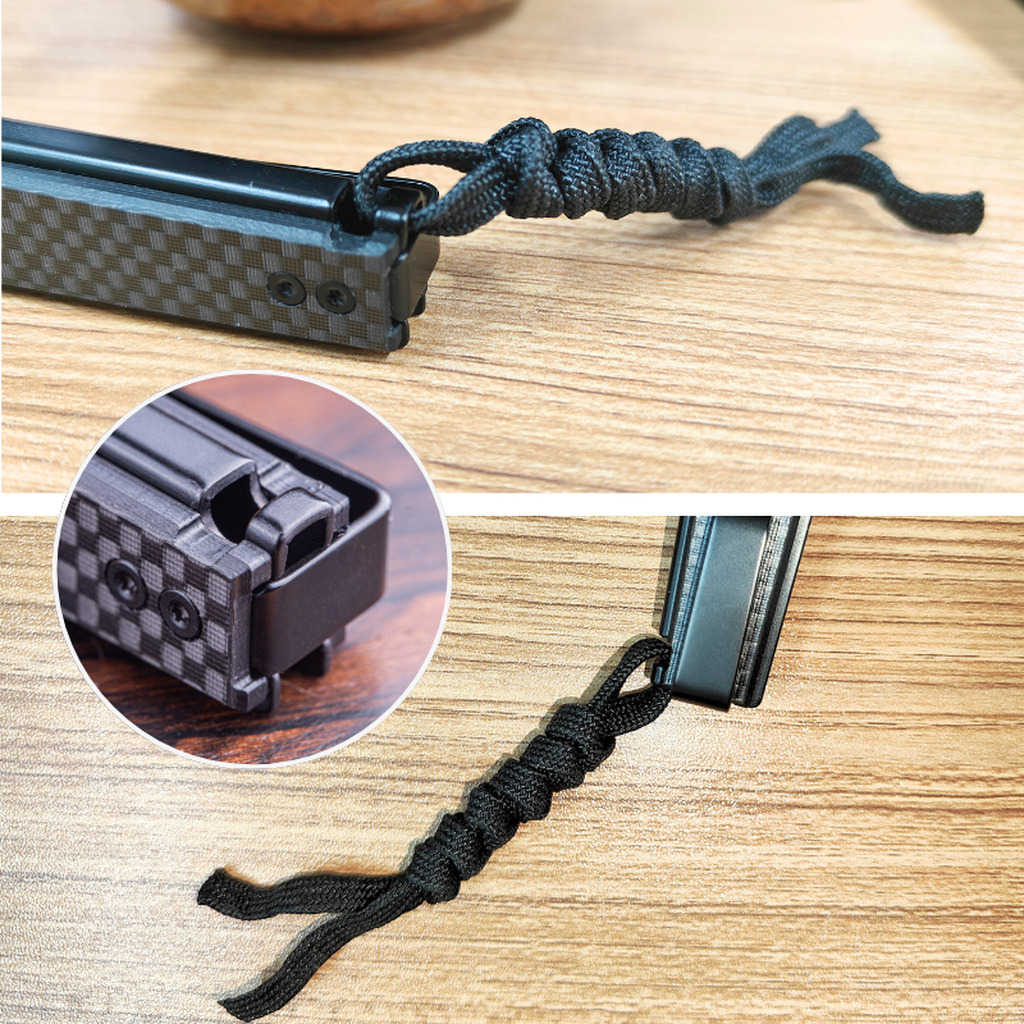• Otwór na linkę: dyskretny lanyard hole — pozwala zamocować paracord, linkę lub ozdobę bez zaburzania linii noża.