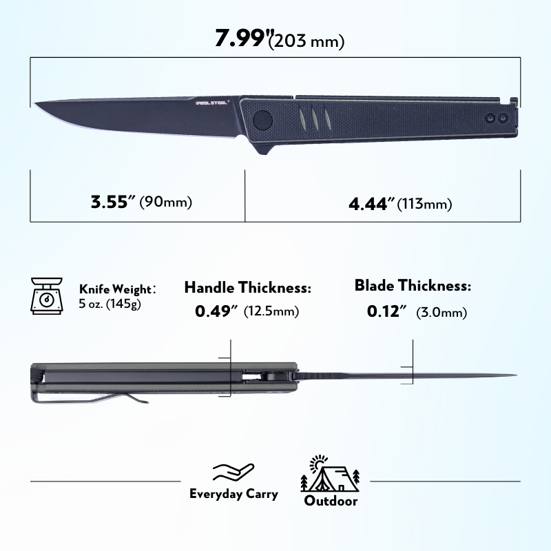 • Stal: Sandvik 14C28N Stainless Steel — odporna na korozję, długo trzyma ostrość i jest łatwa w codziennej konserwacji.
