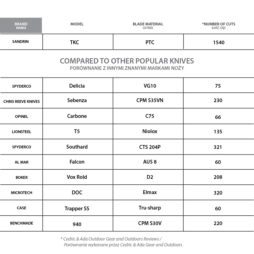 Marka Sandrin Knives ufundowana przez specjalistów w produkcji węglika wolframu, włoską firmę Turmond S.p.A. przebojem “wdarła się” na rynek nożowy. Posiadająca ponad 40-letnie doświadczenie fabryka, wyznaczająca trendy w wytwarzaniu różnych rodzajów węglika, stosowanego zresztą w wielu branżach, tym razem spróbowała sił w produkcji innowacyjnego rodzaju węglika przeznaczonego do produkcji głowni noży (Polyhedral Tungsten Carbide – PTC). Projekt zakończył się pełnym sukcesem a noże o niespotykanej dotąd twardości (71 HRC) posiadające świetną ostrość (technologia StaySharp™) utrzymującą się przez czas dłuższy niż w przypadku innych marek zagościły na stałe na rynku. Przesłanie marki, jej twórca Alessandro Colombatto krótko podsumował w następujący sposób: “Dzięki wyjątkowej twardości HRC 71, nasze noże są po prostu niczym innym jak najtwardszymi i najtrwalszymi ostrzami jakie kiedykolwiek powstały”.