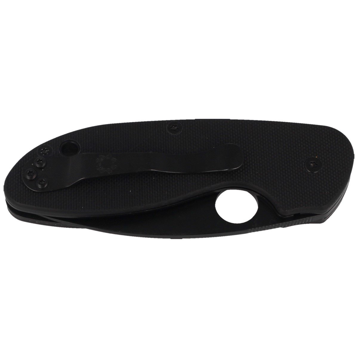 Głownia tego noża ma grubość 3 mm i szeroki zakrzywiony profil typu Drop Point, co gwarantuje doskonałą geometrię krawędzi tnącej przy niskim tarciu. Klinga została wykonana z trwałej stali nierdzewnej 8Cr13MoV, która utrzymuje znakomitą ostrość. Ostrze jest gładkie (Plain) i zostało wyprowadzone szlifem pełnym płaskim (Full Flat Grind), co nie tylko zapewnia doskonałe właściwości tnące, ale także redukuje wagę noża. Odblaski są eliminowane dzięki czarnej powłoce Black Finish. Duże okrągłe wycięcie SpyderHole o średnicy 14 mm (patent Spyderco) ułatwia otwieranie klingi nawet w warunkach zimnych, mokrych lub w rękawicach. Dodatkowo, karbowane podparcie, takie jak rampa pod kciukiem (spine jimping) i finger choil jimping (podcięcie pod palec wskazujący między rękojeścią a krawędzią tnącą), umożliwiają precyzyjną kontrolę nad nożem.