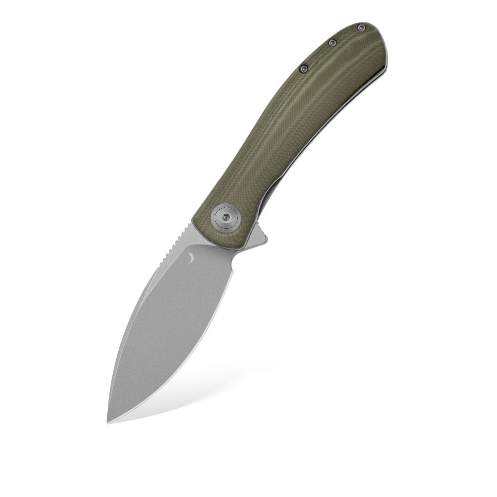 - Rękojeść: Okładki z oliwkowego G10 (OD green G10), stalowe linersy i backspacer, stalowy klips typu Deep Carry / Tip-Up