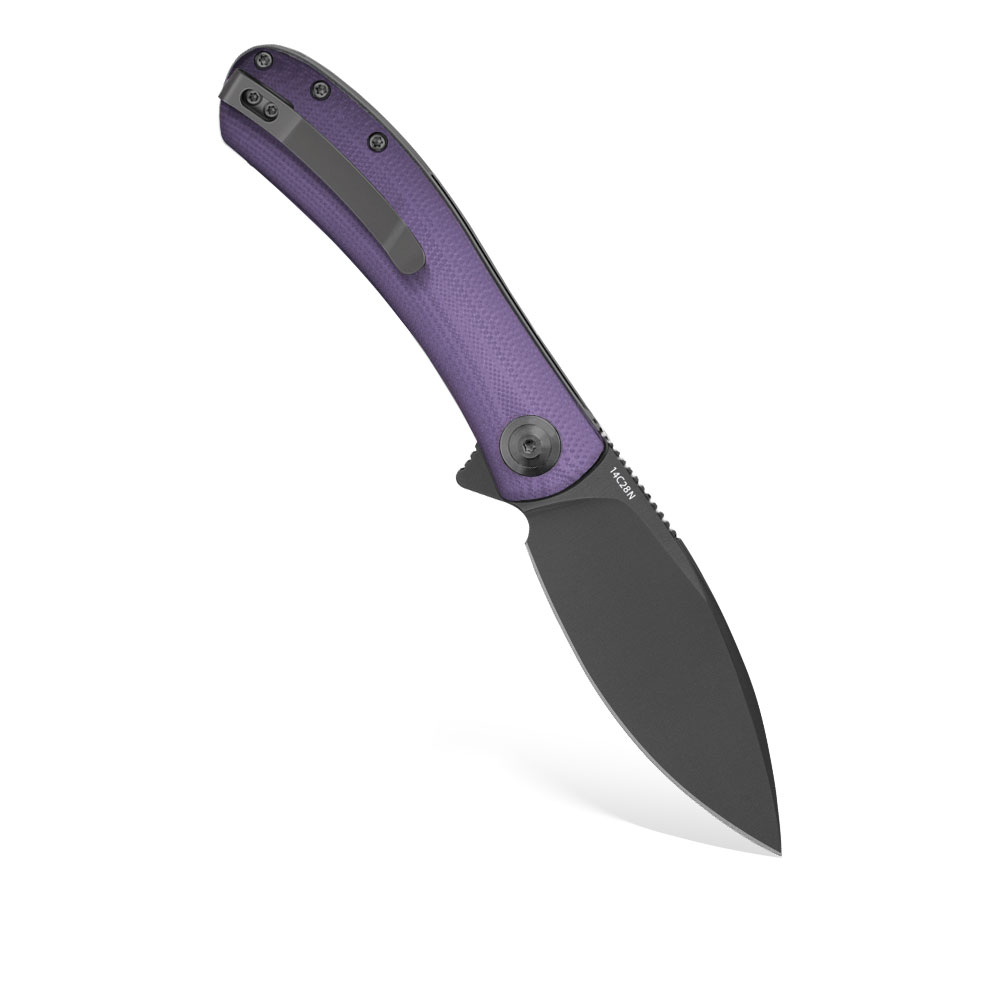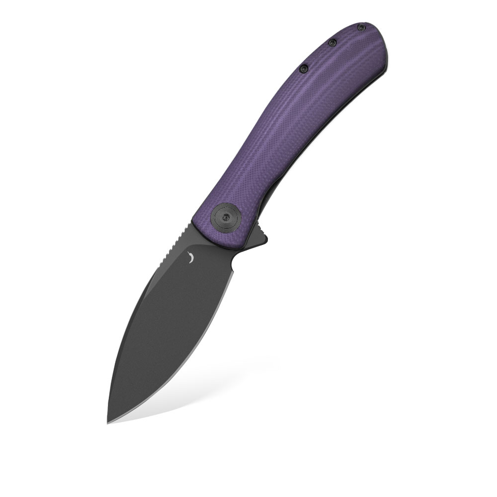 - Rękojeść: Okładki z fioletowego G10 (purple G10), stalowe linersy i backspacer, stalowy klips typu Deep Carry / Tip-Up