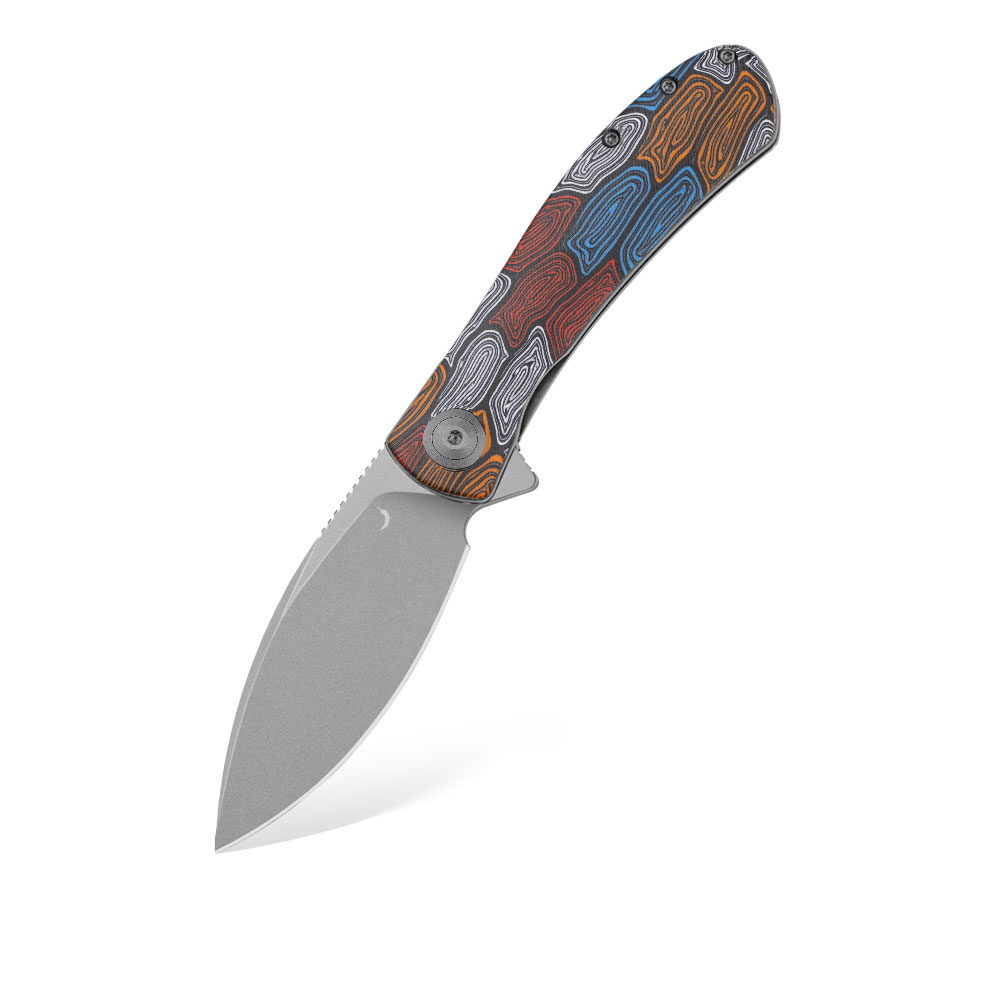 - Rękojeść: Okładki z multikolorowego G10 o wzorze skorupy żółwia (Kaleidoscope Turtle G10), stalowe linersy i backspacer, stalowy klips typu Deep Carry / Tip-Up