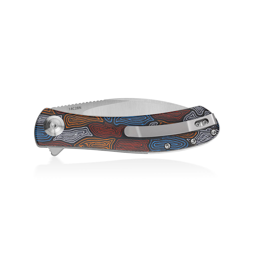 - Rękojeść: Okładki z multikolorowego G10 o wzorze skorupy żółwia (Kaleidoscope Turtle G10), stalowe linersy i backspacer, stalowy klips typu Deep Carry / Tip-Up