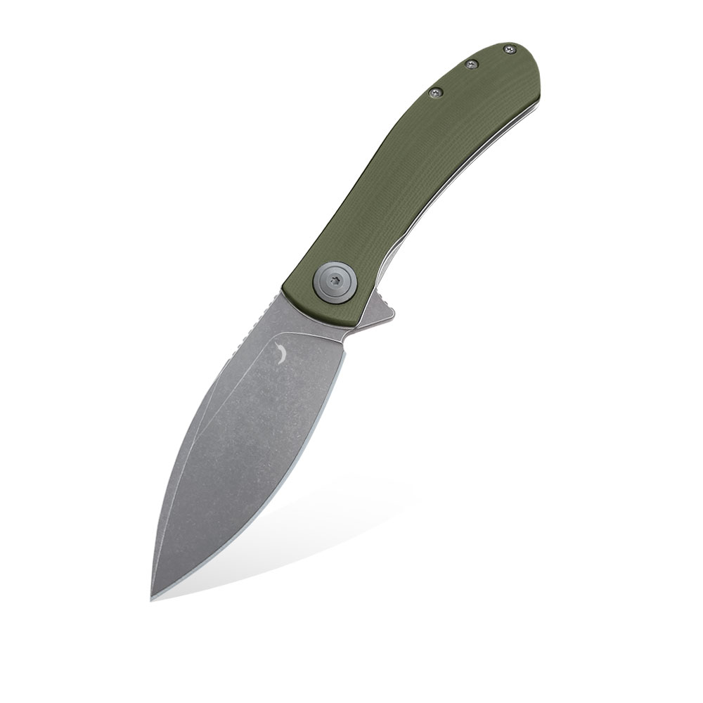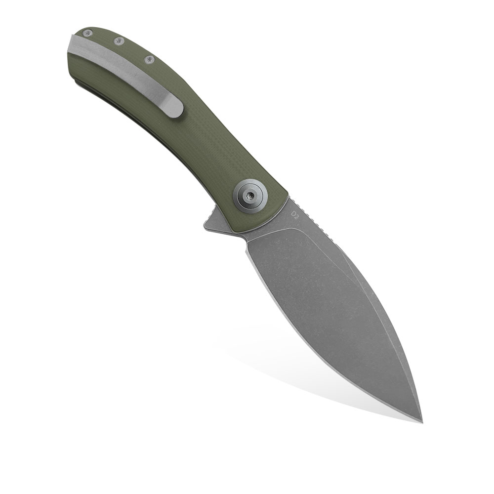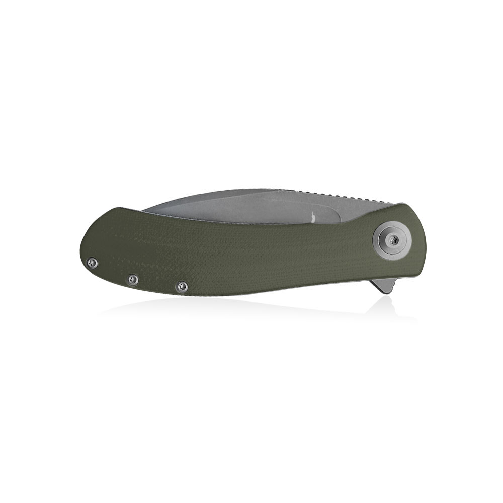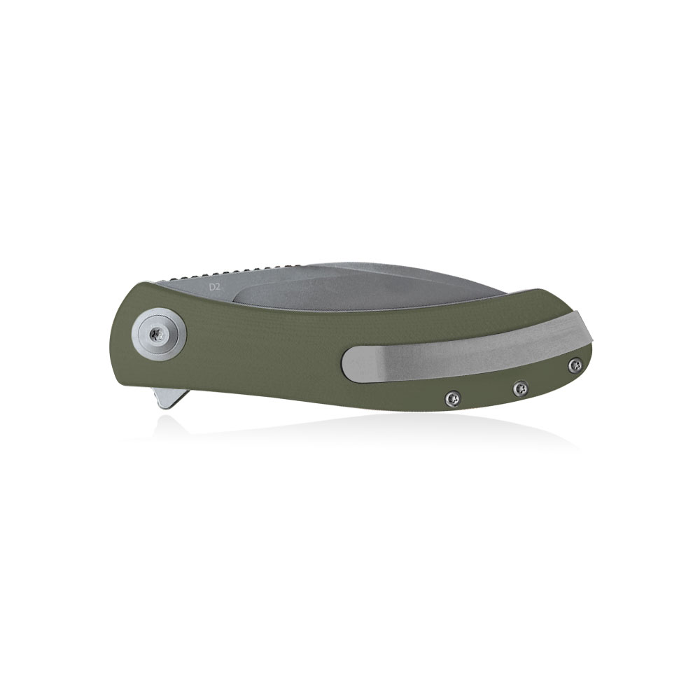 - Rękojeść: stalowe linersy i backspacer, okładki z oliwkowego G10 (OD Green G10), stalowy klips typu Deep Carry / Tip-Up