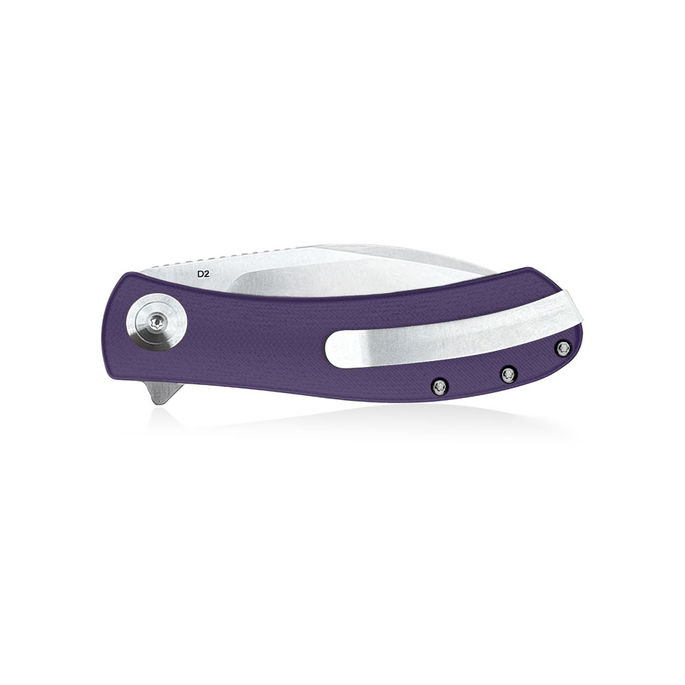 - Rękojeść: stalowe linersy i backspacer, okładki z fioletowego G10 (purple G10), stalowy klips typu Deep Carry / Tip-Up
