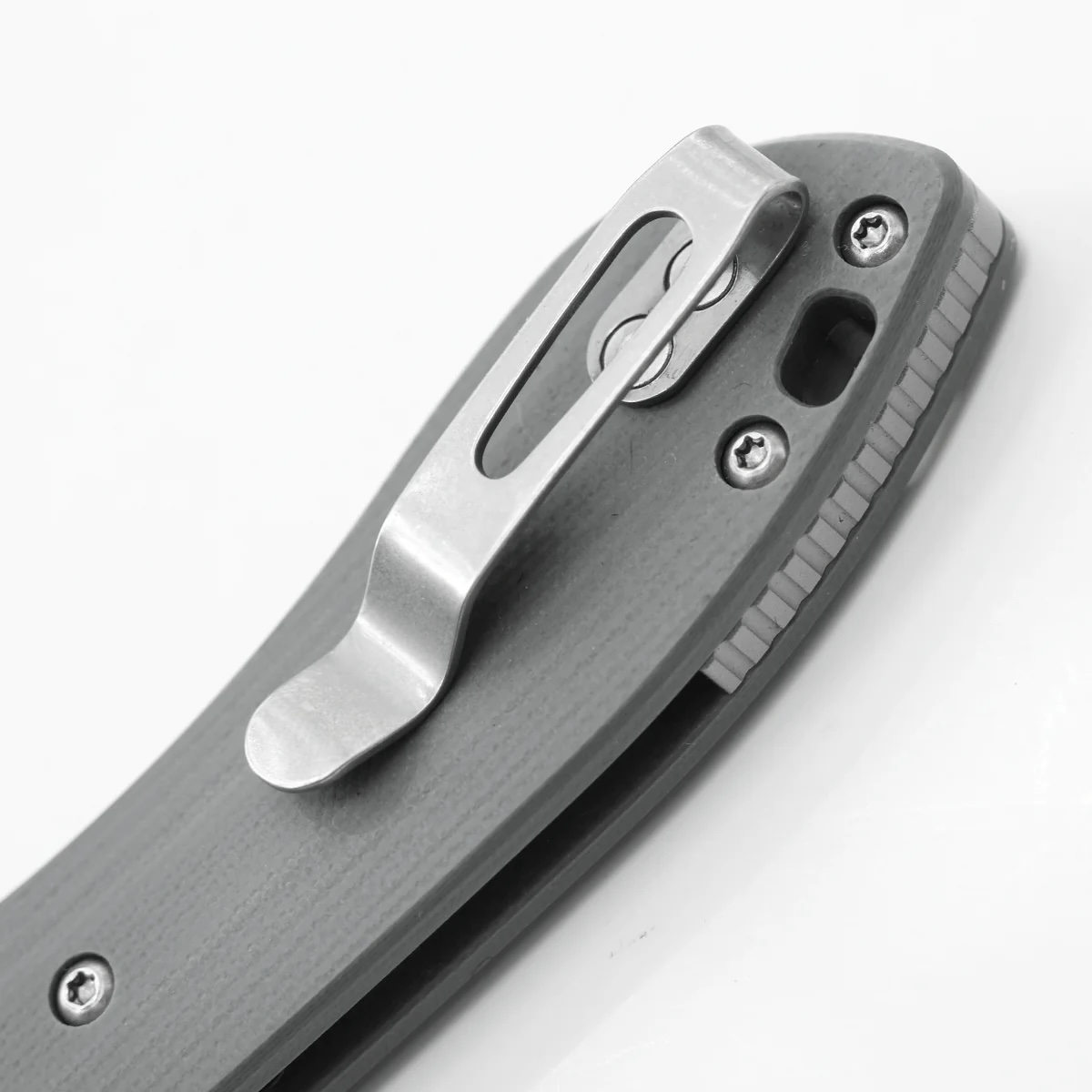 Stalowy klips mocujący umiejscowiony w tylnej części rękojeści zapewnia stabilne przenoszenie w kieszeni, zamocowanie w plecaku, sakwie, nerce itd. Klips wykonano ze stali nierdzewnej i zamontowano go w pozycji tip-up (wierzchołek ostrza skierowany do góry w momencie zaczepienia noża klipsem). Klips można zamontować na wybranej stronie noża, co w połączeniu ze sposobem otwierania kołkiem i blokadą czyni nóż przyjaznym dla użytkowników lewo i praworęcznych.