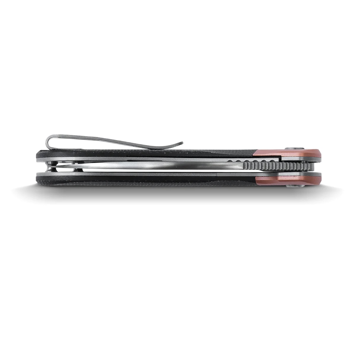 - Rękojeść: korpus ze stali nierdzewnej (linersy), okładki z micarty (black | czarne), klips do przenoszenia ze stali nierdzewnej (Tip-Up, right-carry | prawostronny), bolster z miedzi (copper)