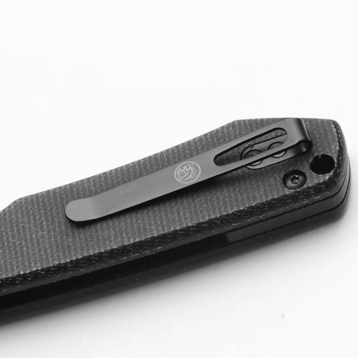 - Rękojeść: okładki z micarty (black | czarna) osadzone na stalowym korpusie (linersy), backspacer z micarty (black | czarna), klips do przenoszenia ze stali nierdzewnej (Tip-Up, reversible | obustronny)