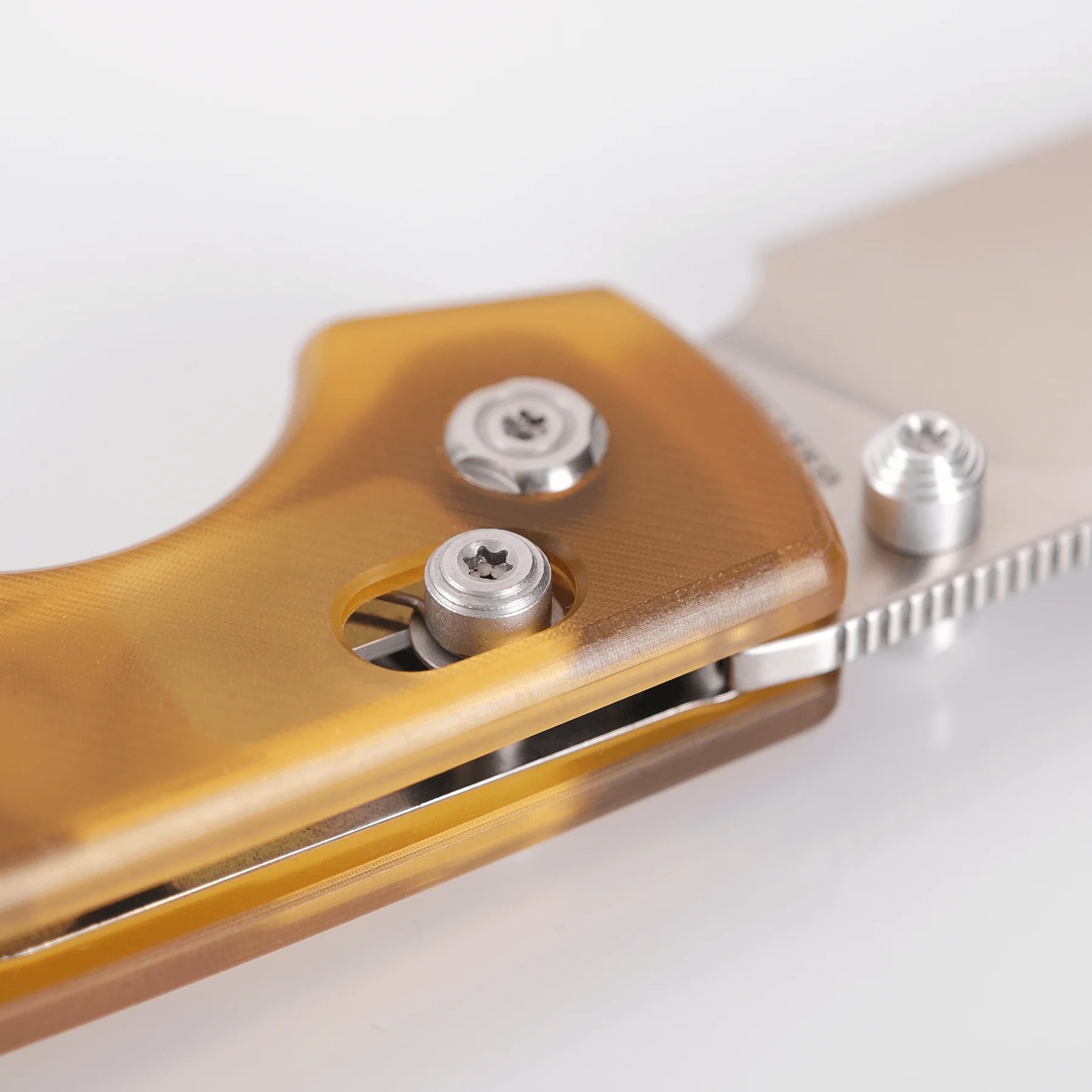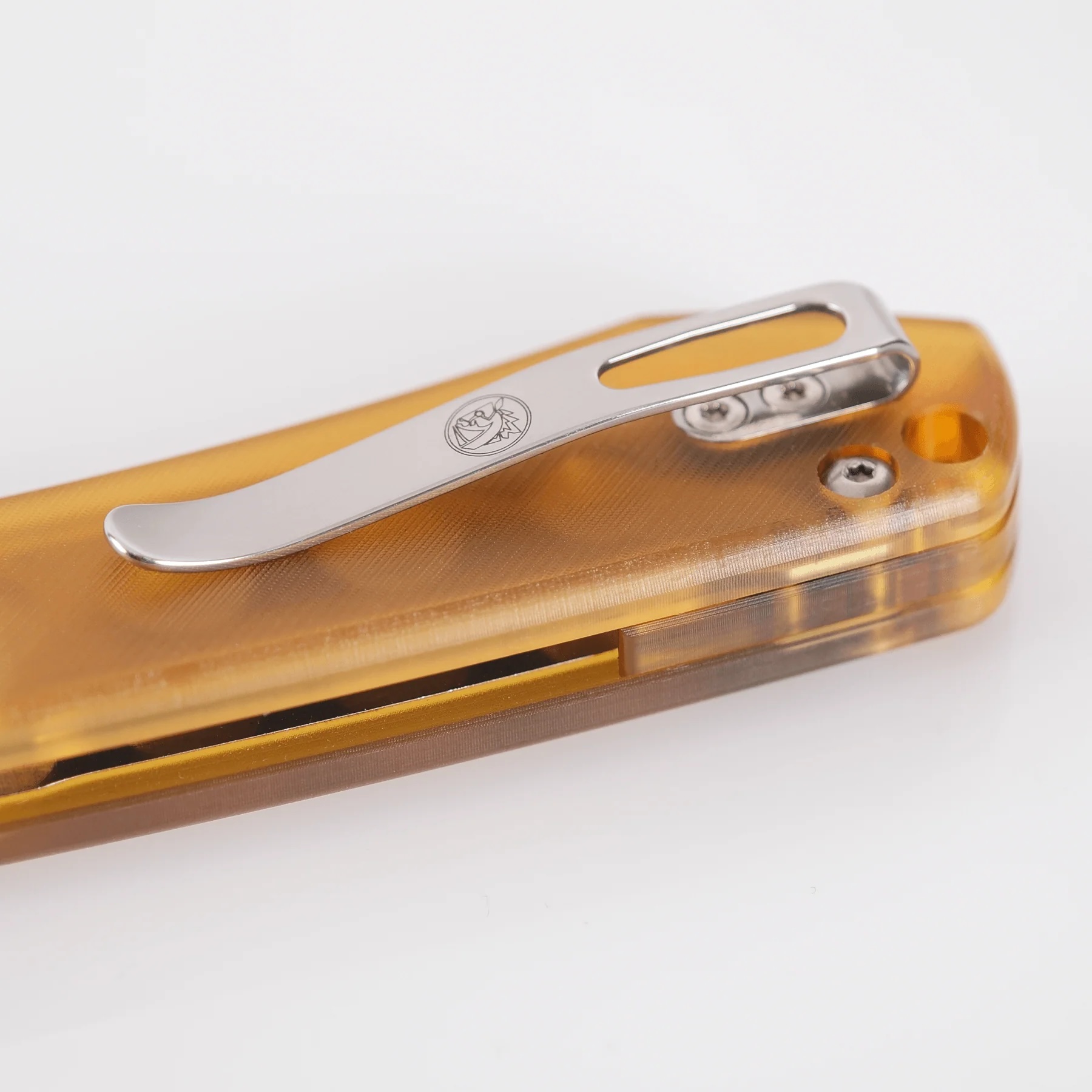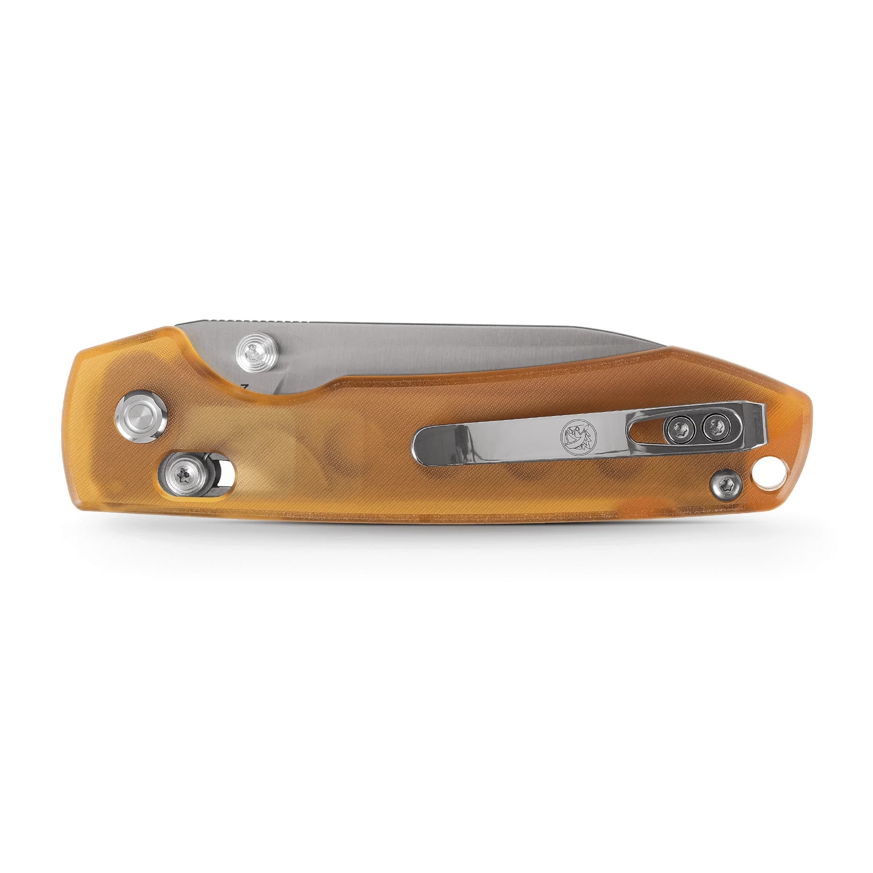 - Rękojeść: korpus z PEI (amber | bursztyn), klips do przenoszenia ze stali nierdzewnej (Tip-Up, reversible | obustronny)