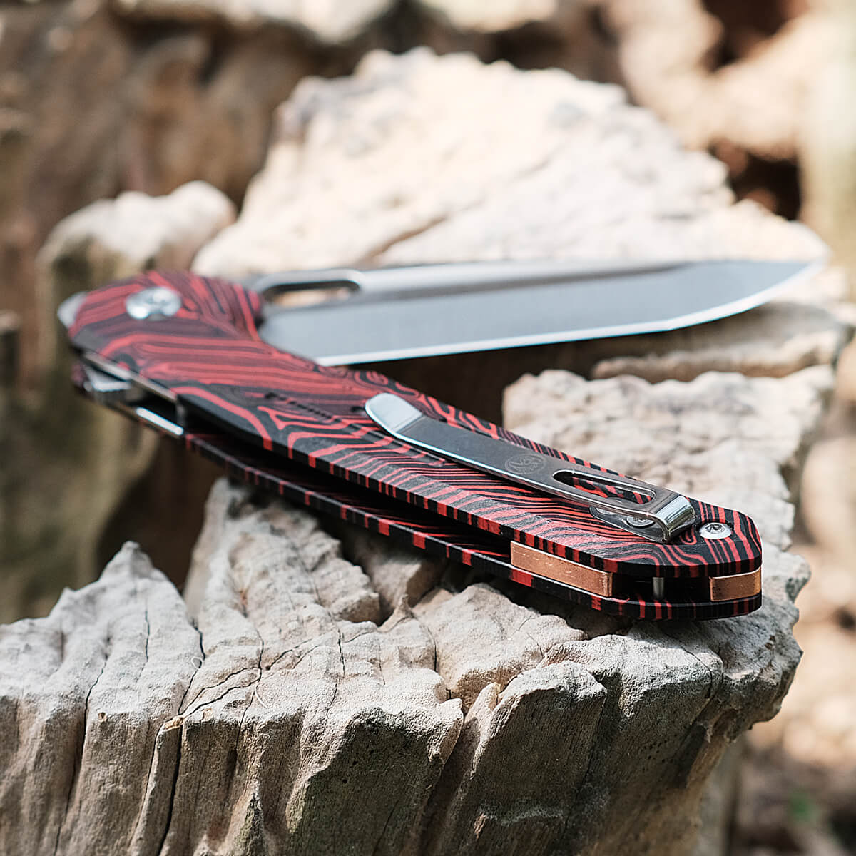 - Rękojeść: korpus ze stali nierdzewnej (linersy), okładki z G10 (GT-Mascus | Topo G10 => Red | kolor dominujący czerwony), klips do przenoszenia ze stali nierdzewnej (Tip-Up, reversible | obustronny), backspacer z miedzi (copper)