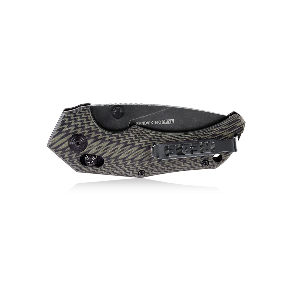 Otwieranie noża odbywa się za sprawą obustronnych kołków. Opcjonalnie nóż otwieramy za pomocą zwolnienia blokady. Rozkładanie noża następuje bardzo swobodnie i płynnie dzięki wyposażeniu go w łożyska kulkowe. Nóż posiada samoczynnie ustawiającą się podczas jego otwierania stabilną i wytrzymałą blokadę chroniącą przed niekontrolowanym zamknięciem podczas używania (axis lock). Na grzbiecie ostrza znajduje się karbowanie (jimping) pełniące rolę podpory na kciuk przy cięciach wymagających docisku a w jego dolnej części rowek na palec wskazujący, który pomoże skrócić chwyt.