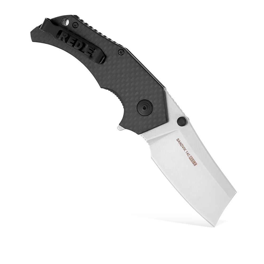 - Ostrze: składane (folding knife), cleaver ze szlifem płaskim, gładka krawędź tnąca