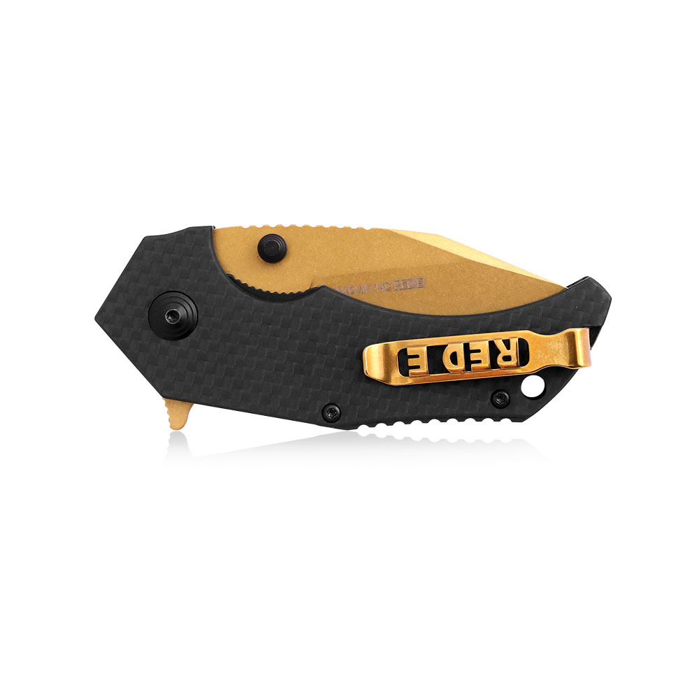 Otwieranie noża odbywa się za sprawą obustronnych kołków. Opcjonalnie nóż otwieramy za pomocą płetwy (flipper). Rozkładanie noża następuje bardzo swobodnie i  płynnie dzięki wyposażeniu go w łożyska kulkowe. Nóż posiada samoczynnie ustawiającą się podczas jego otwierania stabilną i wytrzymałą blokadę chroniącą przed niekontrolowanym zamknięciem podczas używania (liner lock). Na grzbiecie ostrza znajduje się karbowanie (jimping) pełniące rolę podpory na kciuk przy cięciach wymagających docisku a w jego dolnej części rowek na palec wskazujący, który pomoże skrócić chwyt.