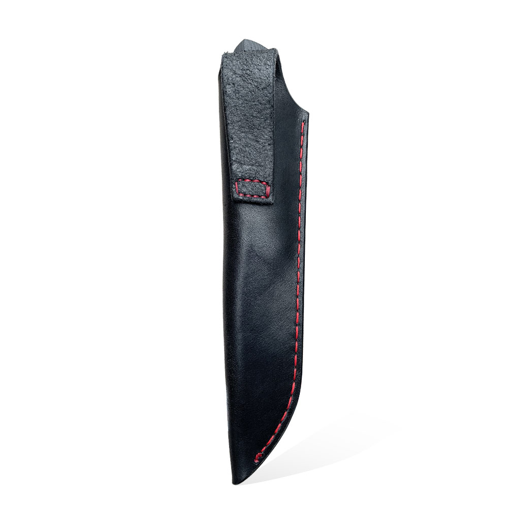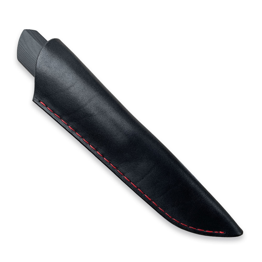 Nóż wyposażony został w czarną pochwę z naturalnej skóry. Pochwa posiada uchwyt do paska na montaż pionowy. Pochwa przeszyta została nicią koloru spójnego z kolorystyką rękojeści noża (kolor nici odpowiada kolorowi dodatku w rękojeści).NAZWA: Modern Puukko