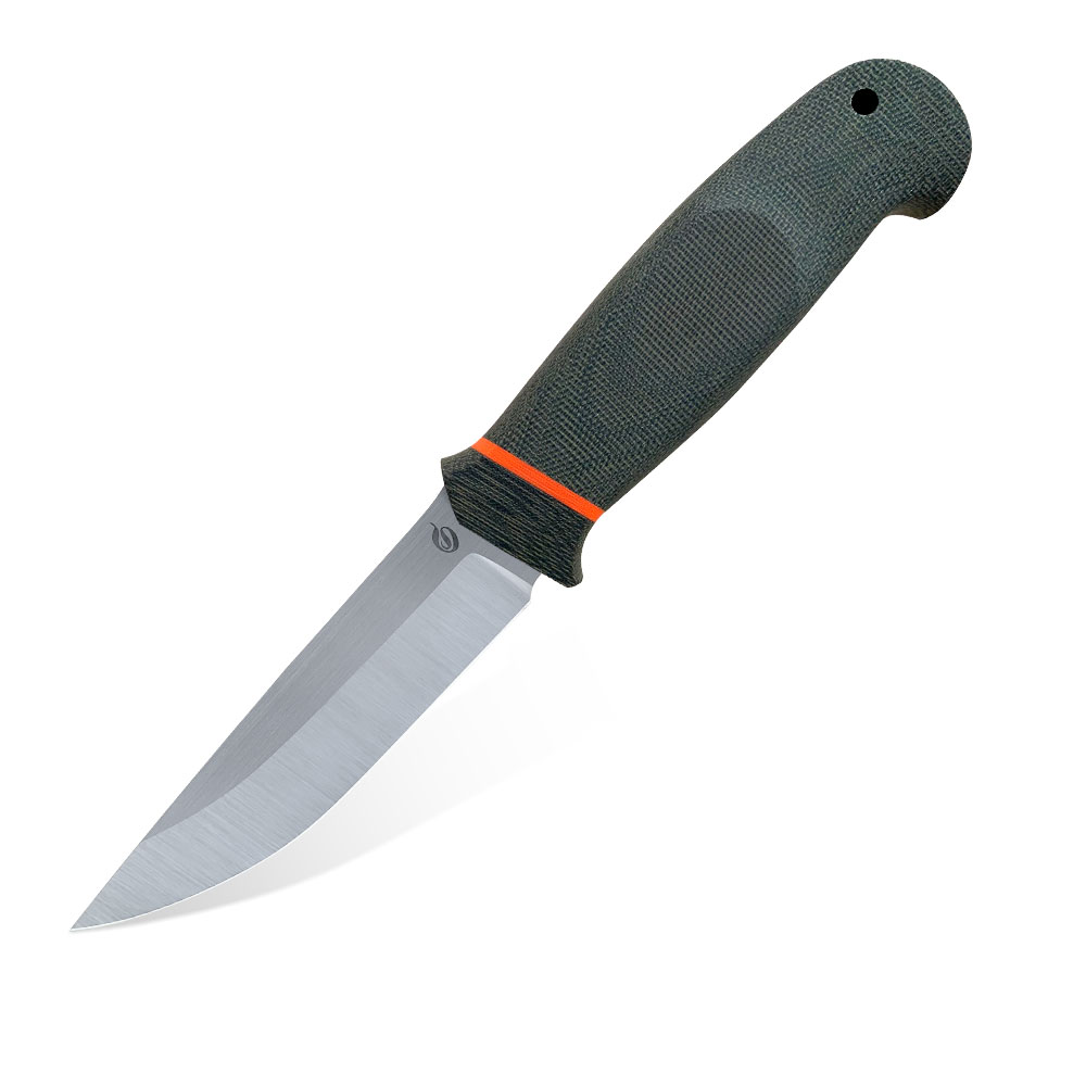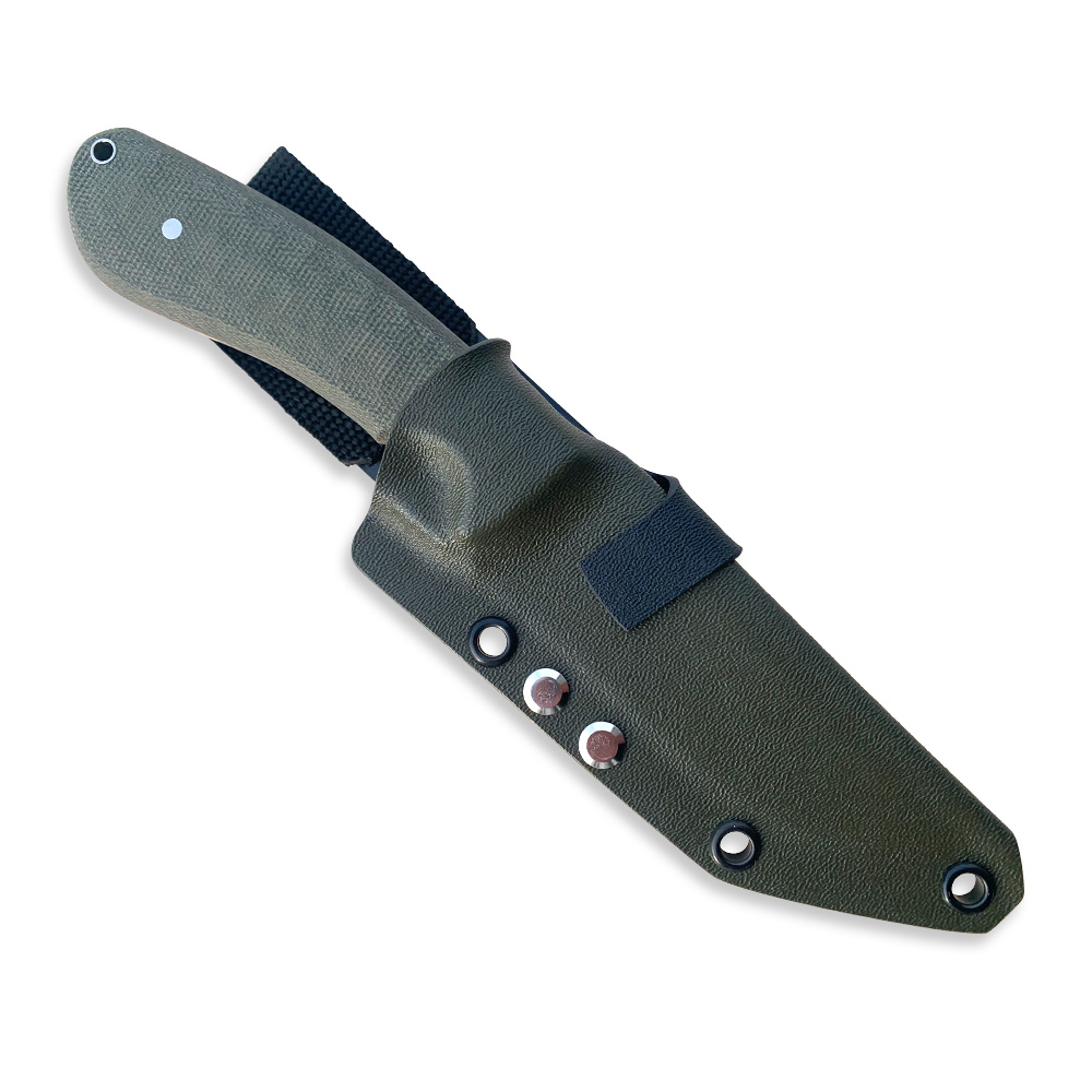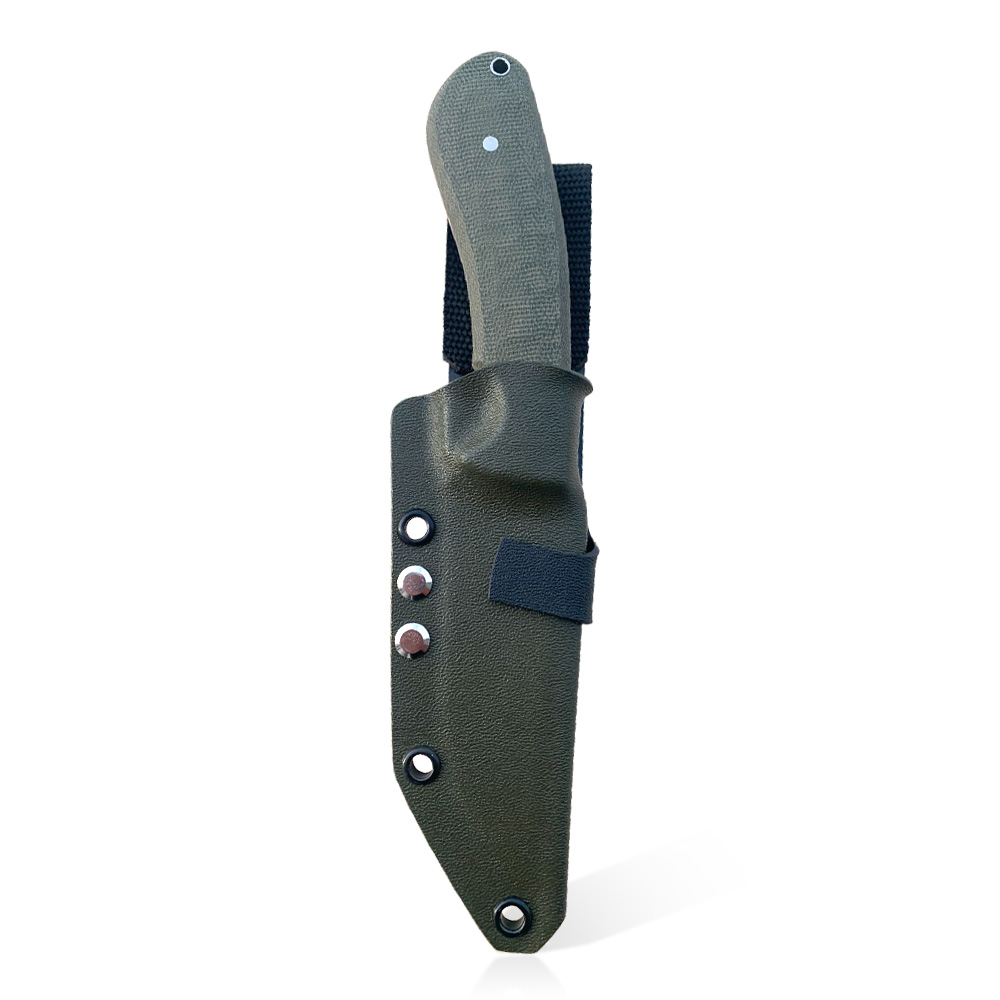 Okładziny rękojeści wykonane zostały z zielonego laminatu Green Canvas Micarta® odpornego na wilgoć, zmiany temperatury, większość rozpuszczalników i kwasów, posiadającego wysoką odporność na uszkodzenia mechaniczne. Micarta® znana ze swoich doskonałych właściwości, również wizualnych (daje się stylizować na naturalny materiał) ma antypoślizgową, chropowatą strukturę. Okładki posiadają przekładki (linery) z pomarańczowego kompozytu G10, które oprócz efektu wizualnego mają ułatwić znalezienie noża np. po upuszczeniu go w trawę. Okładziny zostały przyklejone i przymocowane stalowymi pinami. W rękojeści zaprojektowany został otwór znajdujący się przy jej zakończeniu, który służy do dodatkowego zabezpieczenia noża przed zgubieniem linką, paracordem itp. Rękojeść o długości 115 mm została zaprojektowana w ten sposób, że trzyma się ją bardzo dobrze niezależnie od wielkości chwytającej go dłoni.