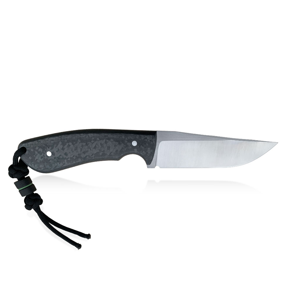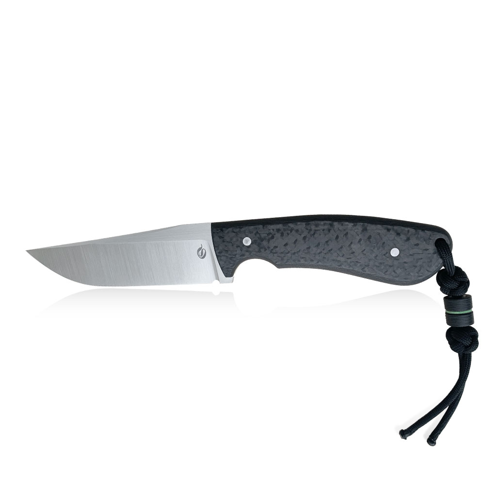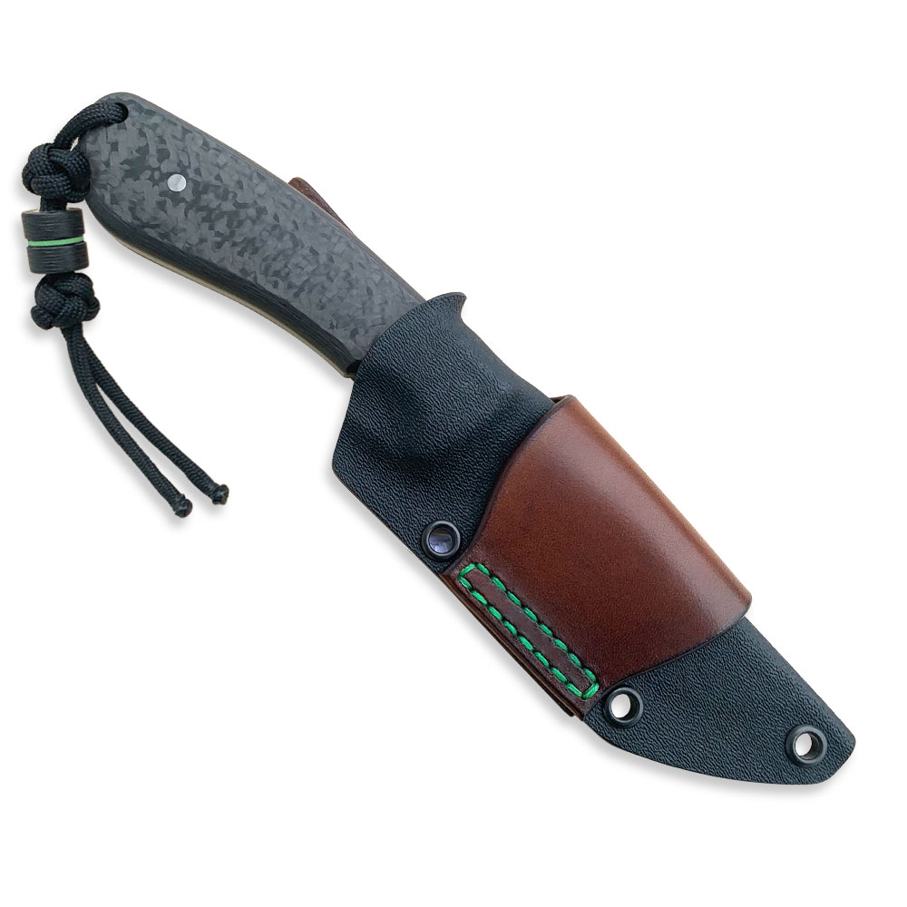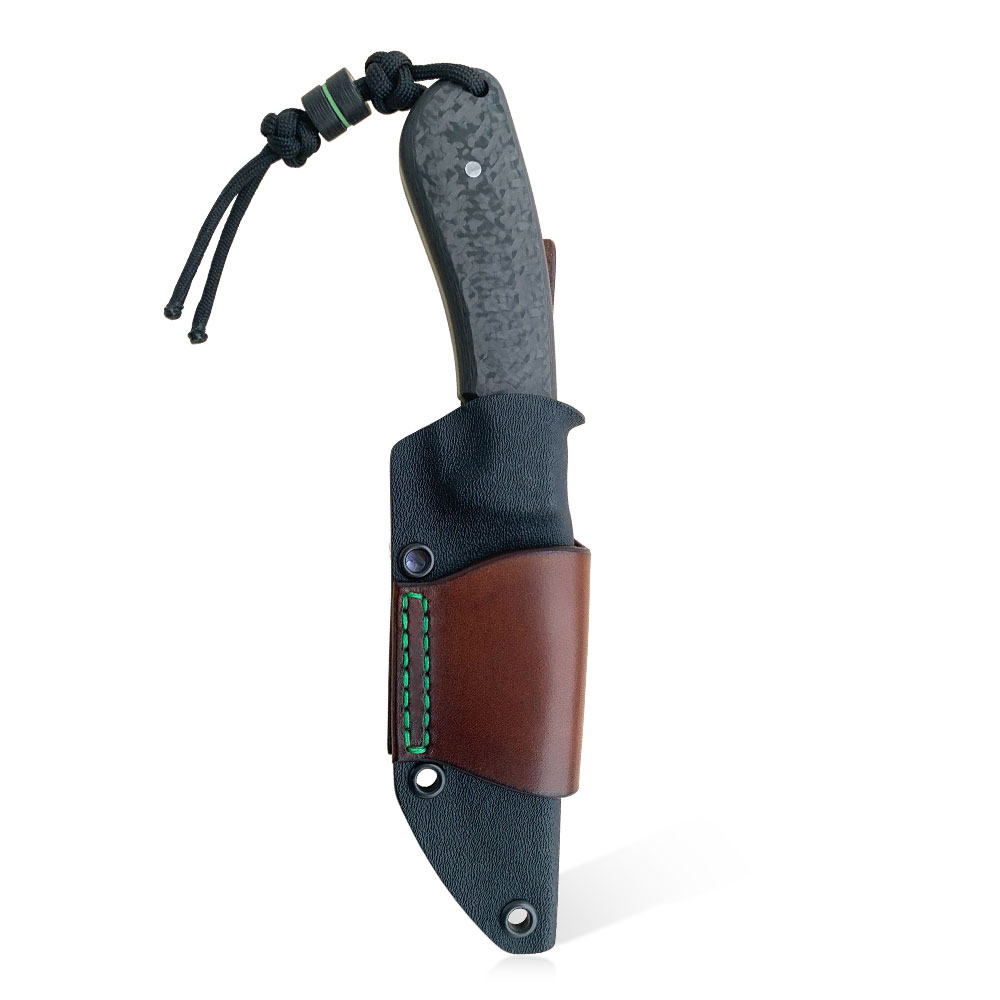 Okładziny rękojeści wykonane zostały z włókna węglowego (carbon fiber) odpornego na wilgoć, zmiany temperatury, większość rozpuszczalników i kwasów, posiadającego wysoką odporność na uszkodzenia mechaniczne. Okładki posiadają przekładki (linery) z zilonego kompozytu G10, które oprócz efektu wizualnego mają ułatwić znalezienie noża np. po upuszczeniu go w trawę. Okładziny zostały przyklejone i przymocowane stalowymi pinami. W rękojeści zaprojektowany został otwór znajdujący się przy jej zakończeniu, który służy do dodatkowego zabezpieczenia noża przed zgubieniem linką, paracordem itp. Rękojeść o długości 115 mm została zaprojektowana w ten sposób, że trzyma się ją bardzo dobrze niezależnie od wielkości chwytającej go dłoni.