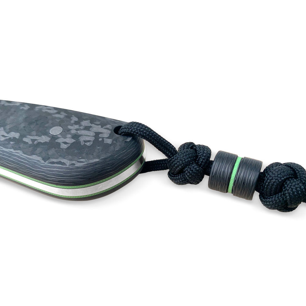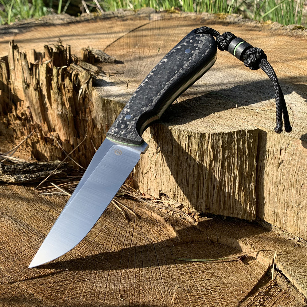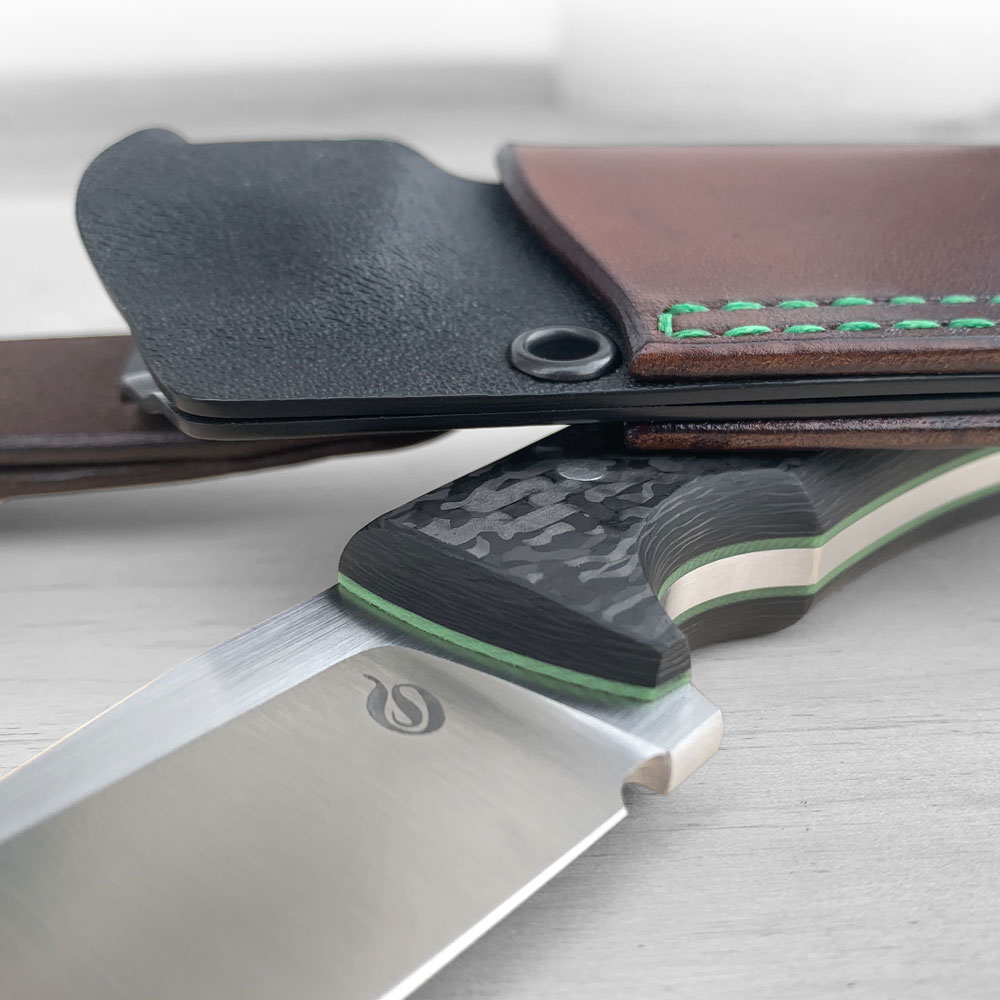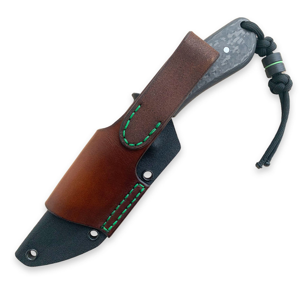Okładziny rękojeści wykonane zostały z włókna węglowego (carbon fiber) odpornego na wilgoć, zmiany temperatury, większość rozpuszczalników i kwasów, posiadającego wysoką odporność na uszkodzenia mechaniczne. Okładki posiadają przekładki (linery) z zilonego kompozytu G10, które oprócz efektu wizualnego mają ułatwić znalezienie noża np. po upuszczeniu go w trawę. Okładziny zostały przyklejone i przymocowane stalowymi pinami. W rękojeści zaprojektowany został otwór znajdujący się przy jej zakończeniu, który służy do dodatkowego zabezpieczenia noża przed zgubieniem linką, paracordem itp. Rękojeść o długości 115 mm została zaprojektowana w ten sposób, że trzyma się ją bardzo dobrze niezależnie od wielkości chwytającej go dłoni.
