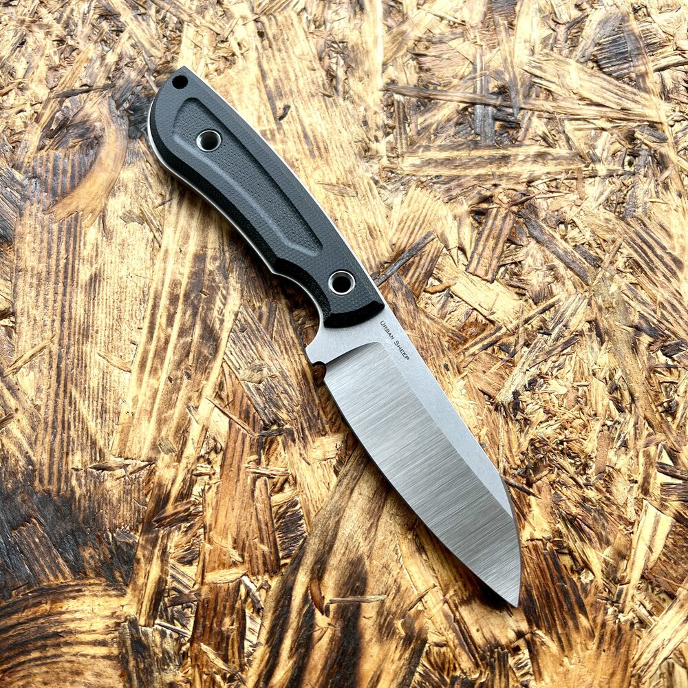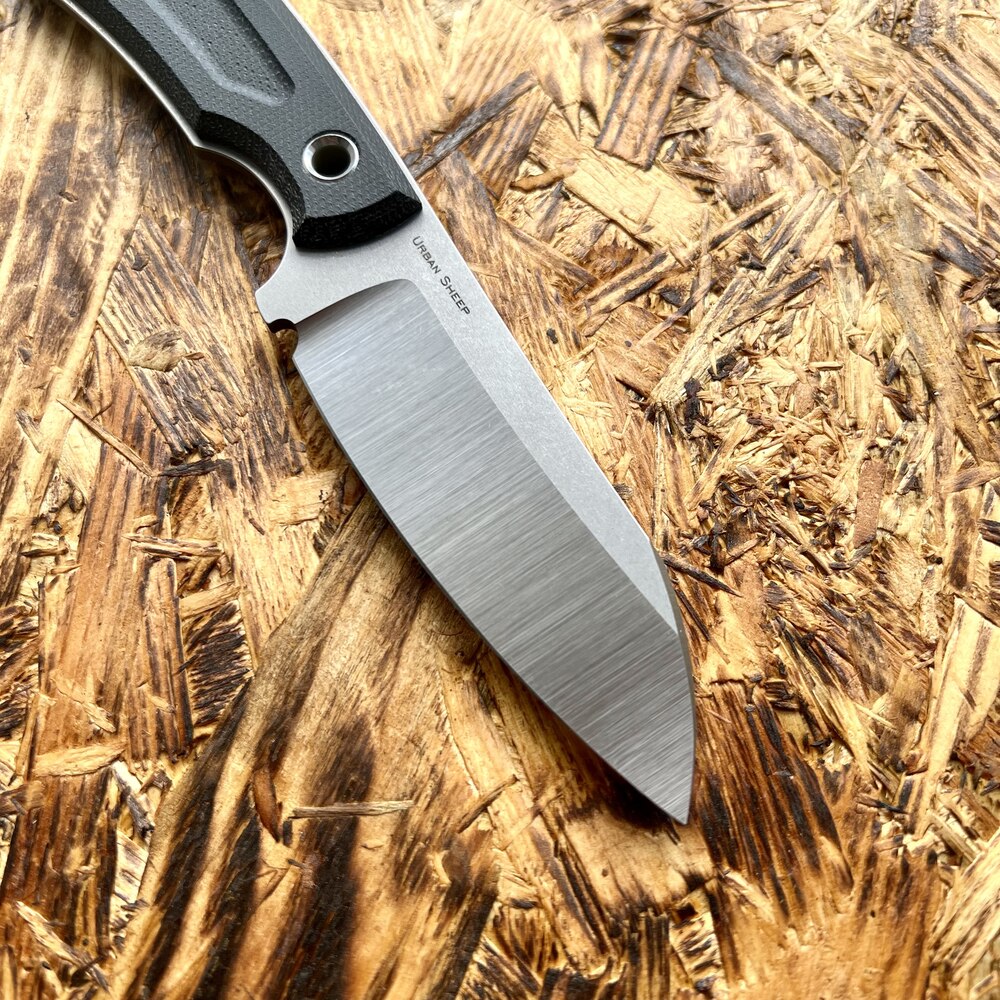 Nóż Sliwkosky Knives Urban Sheep „Noir” to poręczne ostrze o użytkowo-miejskim sznycie. Poza zauważalną symetrią projektu, odbiciem wierzchołka ostrza w zakończeniu rękojeści, nóż wyróżniają: kompaktowy rozmiar, świetna ergonomia chwytu i ostrze o świetnych właściwościach tnących. Urban Sheep wyróżnia przede wszystkim głownia o profilu sheepsfoot, ale wyprofilowana z wybrzuszoną krawędzią tnącą, w taki sposób że można jej używać prawie tak jak uniwersalnego drop point’a. W dodatku szlif wklęsły uwydatnia świetne właściwości tnące, szczególnie przy przygotowywaniu żywności, a wierzchołek krawędzi tnącej pomaga przy cięciach wymagających docisku.
