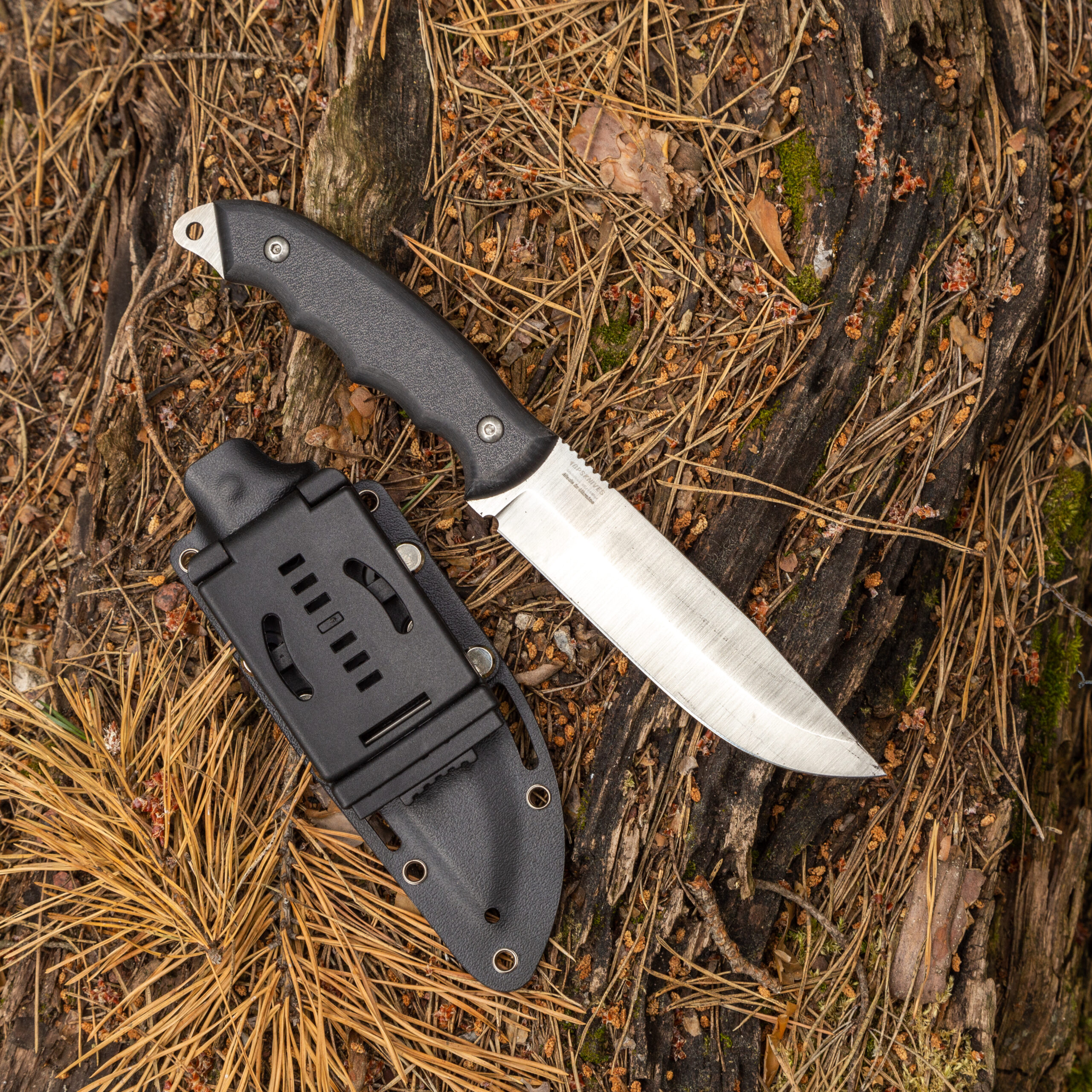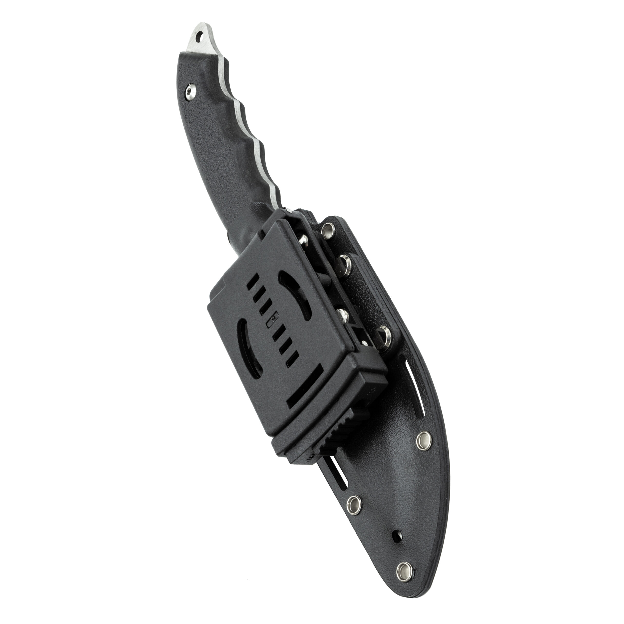W zestawie z nożem otrzymujemy kaburę wykonaną z Kydexu. Kydex cechuje się wysoką odpornością na uderzenia, zarysowania, charakteryzuje się niską chłonnością wilgoci, odpornością na różnorodne warunki atmosferyczne oraz wiele środków chemicznych. Kabury z niego wykonane użytkujemy wygodnie i długotrwale. Kabura zaopatrzona została w piny przelotowe, do których można przypiąć np. uchwyt na krzesiwo (nie znajduje się w zestawie) lub użyć ich do jej zamocowania na plecaku. Mocowana jest do pasa za sprawą klamry typu Tek-Lok umożliwiającej przenoszenie w pionie lub poziomie (po odkręceniu, zmianie pozycji klamry i przykręceniu).