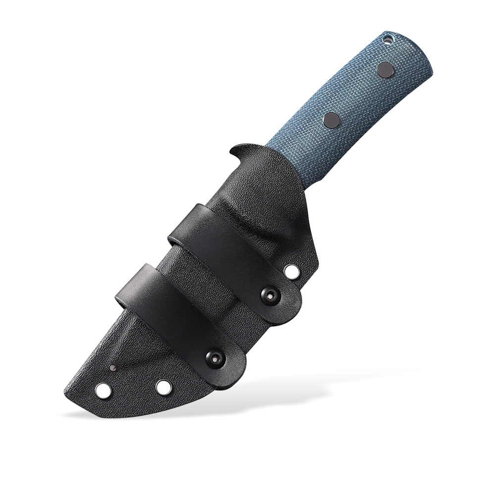 W zestawie z nożem otrzymujemy kaburę z tworzywa Kydex. Kydex cechuje się wysoką odpornością na uderzenia, zarysowania, charakteryzuje się niską chłonnością wilgoci, odpornością na różnorodne warunki atmosferyczne oraz wiele środków chemicznych. Kabury z niego wykonane użytkujemy wygodnie i długotrwale. Dla ułatwienia w wyjmowaniu noża, zaprojektowana została podporę na kciuk, dzięki której nóż możemy wyjąć w sposób kontrolowany i bezpieczny. Kabura zaopatrzona została w piny przelotowe, do których można przypiąć np. uchwyt na krzesiwo (nie znajduje się w zestawie) lub użyć ich do jej zamocowania na plecaku.
