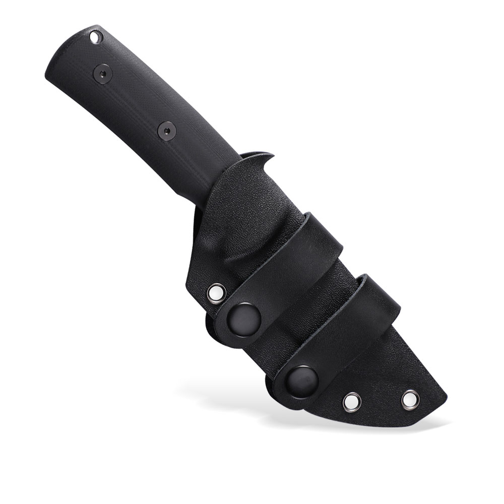 W zestawie z nożem otrzymujemy kaburę z tworzywa Kydex. Kydex cechuje się wysoką odpornością na uderzenia, zarysowania, charakteryzuje się niską chłonnością wilgoci, odpornością na różnorodne warunki atmosferyczne oraz wiele środków chemicznych. Kabury z niego wykonane użytkujemy wygodnie i długotrwale. Dla ułatwienia w wyjmowaniu noża, zaprojektowana została podporę na kciuk, dzięki której nóż możemy wyjąć w sposób kontrolowany i bezpieczny. Kabura zaopatrzona została w piny przelotowe, do których można przypiąć np. uchwyt na krzesiwo (nie znajduje się w zestawie) lub użyć ich do jej zamocowania na plecaku.