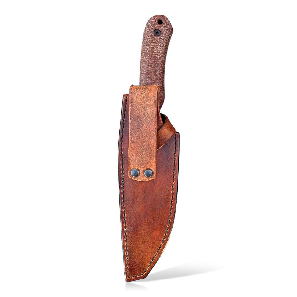 Do przenoszenia noża służy wykonana całkowicie ręcznie skórzana pochwa w kolorze brązowym. Pochwa wykonana została z wysokiej jakości garbowanej roślinne skóry. Przeszycia wykonane zostały grubymi nićmi masywnym ściegiem. Krawędzie ładnie zakończono, obrabiając je na gładko. Pochwa posiada dużą przelotkę na przypięcie do paska, a sam nóż przed wypadnięciem zabezpiecza szlufka z masywnym zatrzaskiem.NAZWA: Buddy