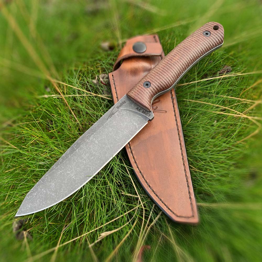 Prezentowany nóż Buddy wykonany został ze stali proszkowej CPM 3V. Jest to stal produkowana przez amerykańską firmę Crucible Industries znaną z produkcji stali CPM S35VN, CPM S45VN, CPM S90VN i innych z tej rodziny. CPM 3V wybierana jest do produkcji noży o dużych rozmiarach przez wzgląd na swoją odporność na wykruszenia i bardzo wysoką odporność na przeciążenia. Stal ta wolno się ściera oraz długo pozostaje ostra. Stal CPM 3V nie jest stalą nierdzewną, dlatego aby łatwiej można było o nią zadbać w prezentowanym nożu wykończono ją metodą acid-stonewash nadającą ostrzu ciemną barwę oraz świetnie maskującą niedoskonałości mogące powstać w trakcie użytkowania. Nóż wykonany został w jednego kawałka stali, czyli posiada tzw. budowę full-tang, bodajże najbardziej wytrzymałą konstrukcję stosowaną w nożach z ostrzem stałym.