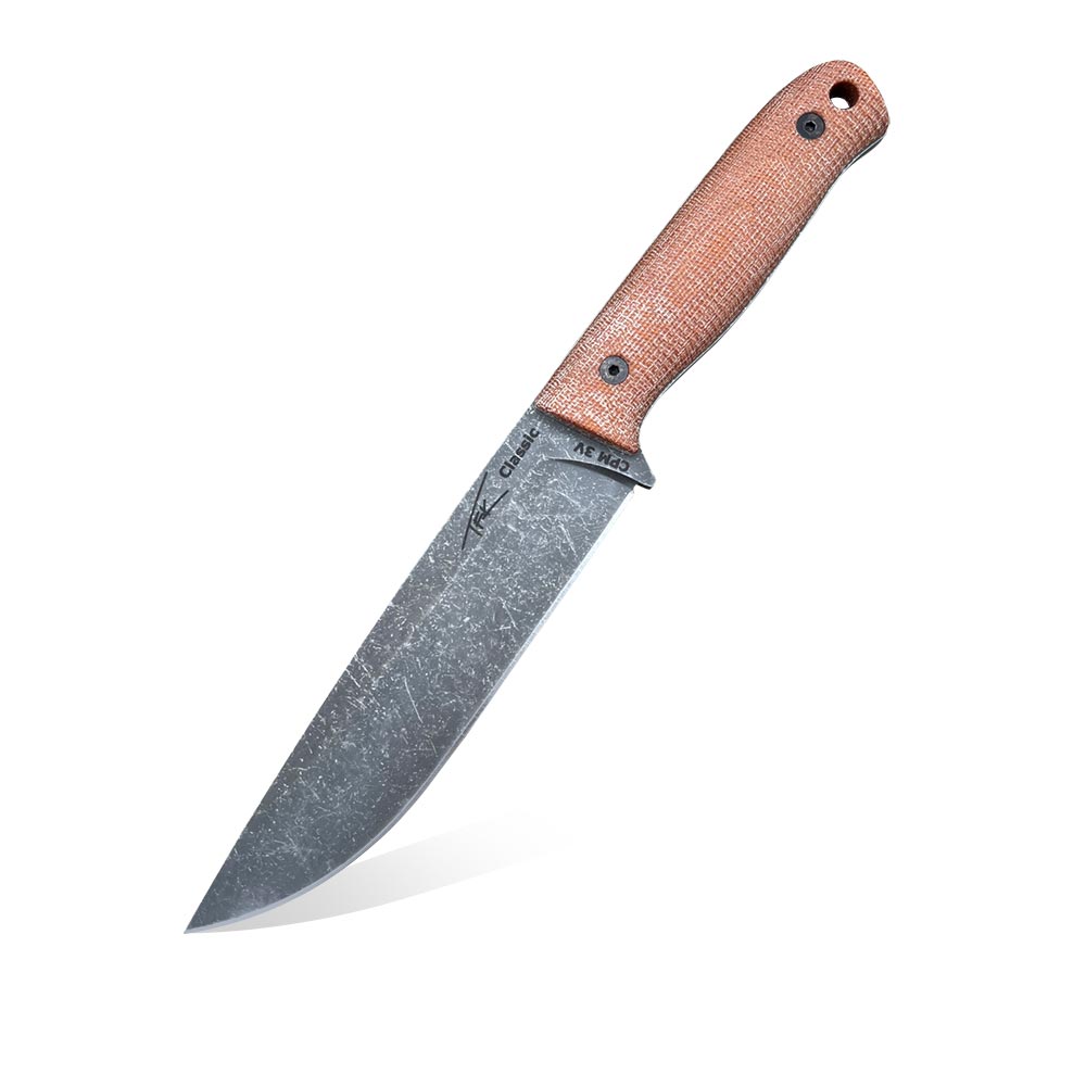 Prezentowany nóż Classic wykonany został ze stali proszkowej CPM 3V. Jest to stal produkowana przez amerykańską firmę Crucible Industries znaną z produkcji stali CPM S35VN, CPM S45VN, CPM S90VN i innych z tej rodziny. CPM 3V wybierana jest do produkcji noży o dużych rozmiarach przez wzgląd na swoją odporność na wykruszenia i bardzo wysoką odporność na przeciążenia. Stal ta wolno się ściera oraz długo pozostaje ostra. Stal CPM 3V nie jest stalą nierdzewną, dlatego aby łatwiej można było o nią zadbać w prezentowanym nożu wykończono ją metodą acid-stonewash nadającą ostrzu ciemną barwę oraz świetnie maskującą niedoskonałości mogące powstać w trakcie użytkowania. Nóż wykonany został w jednego kawałka stali, czyli posiada tzw. budowę full-tang, w której trzpień klingi przebiega przez całą długość i szerokość rękojeści. Jest to bodajże najbardziej wytrzymała konstrukcja stosowana w nożach z ostrzem stałym.