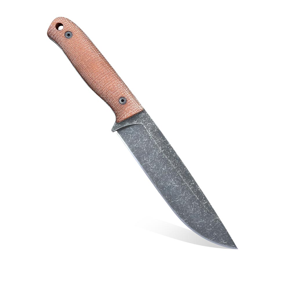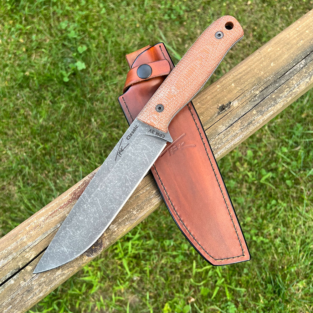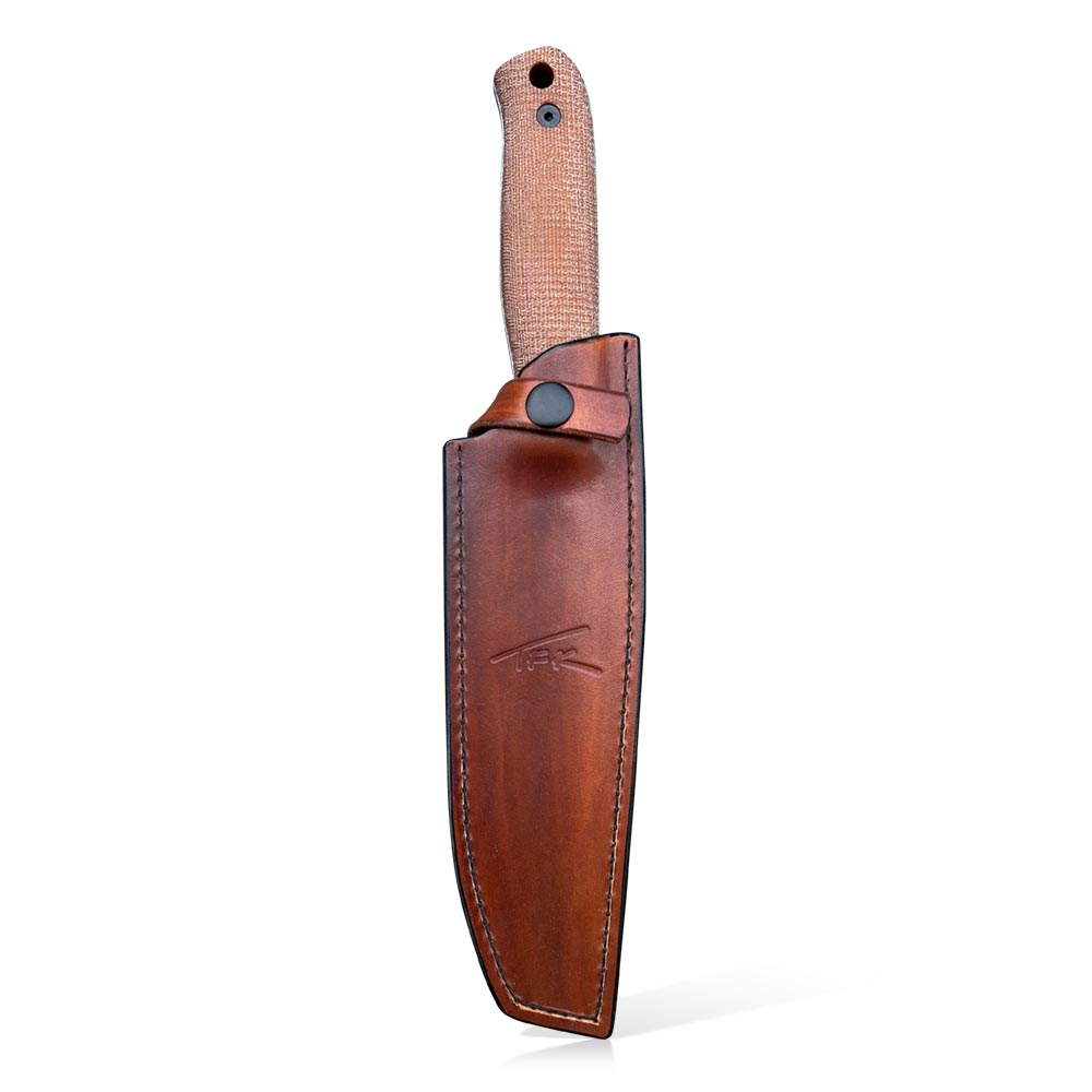 Prezentowany nóż TFK – Tanev Family Knives Classic | CPM 3V | Natural Canvas Micarta wykonany został z amerykańskiej stali CMP3V. Stal wykończono metodą acid-stonewash uzyskując ciemną barwę ostrza. Nóż posiada okładziny rękojeści z brązowej micarty a do jego przenoszenia służy brązowa skórzana pochwa.