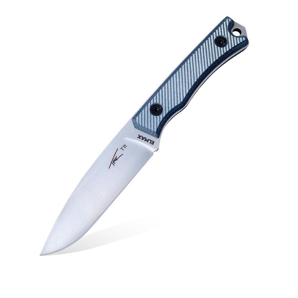 Prezentowany nóż T11 wykonany został ze stali Elmax. Elmax to jedna z kilku stali dostępnych na rynku znajdujących się w absolutnym topie jakościowym materiałów służących do produkcji noży premium. Noże z niej zrobione są ekstremalnie wytrzymałe na przeciążenia, niezwykle długo pozostają ostre i mają doskonałe właściwości antykorozyjne.