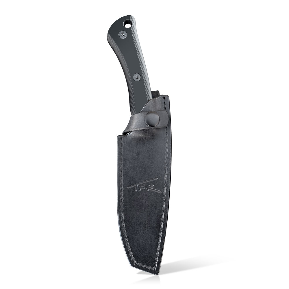 Prezentowany nóż TFK – Tanev Family Knives T7L | CPM 3V | Black G10 wykonany został z amerykańskiej proszkowej ekstremalnie wytrzymałej na przeciążenia i wykruszenia stali CPM 3V. Stal wykończono metodą acid-stonewash uzyskując ciemną barwę ostrza. Nóż posiada okładziny rękojeści z czarnego kompozytu G10 a do jego przenoszenia służy czarna skórzana pochwa.