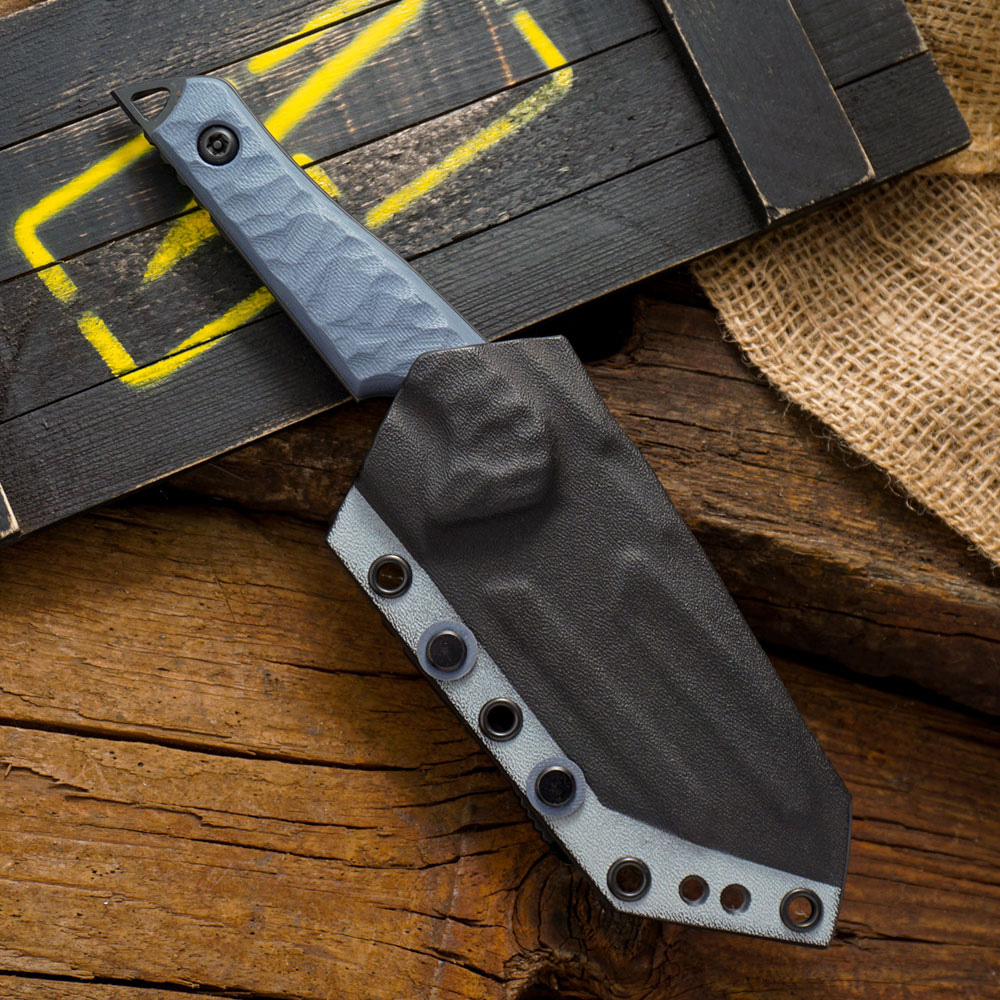 W zestawie z nożem otrzymujemy kaburę z ręcznie formowanego tworzywa Kydex. Kydex cechuje się wysoką odpornością na uderzenia, zarysowania, charakteryzuje się niską chłonnością wilgoci, odpornością na różnorodne warunki atmosferyczne oraz wiele środków chemicznych. Kabury z niego wykonane użytkujemy wygodnie i długotrwale. Dla ułatwienia w wyjmowaniu noża, zaprojektowana została podporę na kciuk, dzięki której nóż możemy wyjąć w sposób kontrolowany i bezpieczny. Kabura zaopatrzona została w piny przelotowe, do których można przypiąć np. uchwyt na krzesiwo (nie znajduje się w zestawie) lub użyć ich do jej zamocowania na plecaku. Kaburę do paska przypinamy za sprawą klamry T-Clip projektu Boba Terzuoli, wykonania CIVIVI, z którą to marką Torbé Knives współpracuje jako designer. T-Clip jest odpowiednikiem uchwytu Tek-Lok i jest kompatybilny z rozwiązaniami typu MOLLE. Zastosowanie klamry T-Clip jest zbieżne z koncepcją knifemekera o przenoszeniu noża w pełnej gotowości, na pasku bezpośrednio pod ręką.